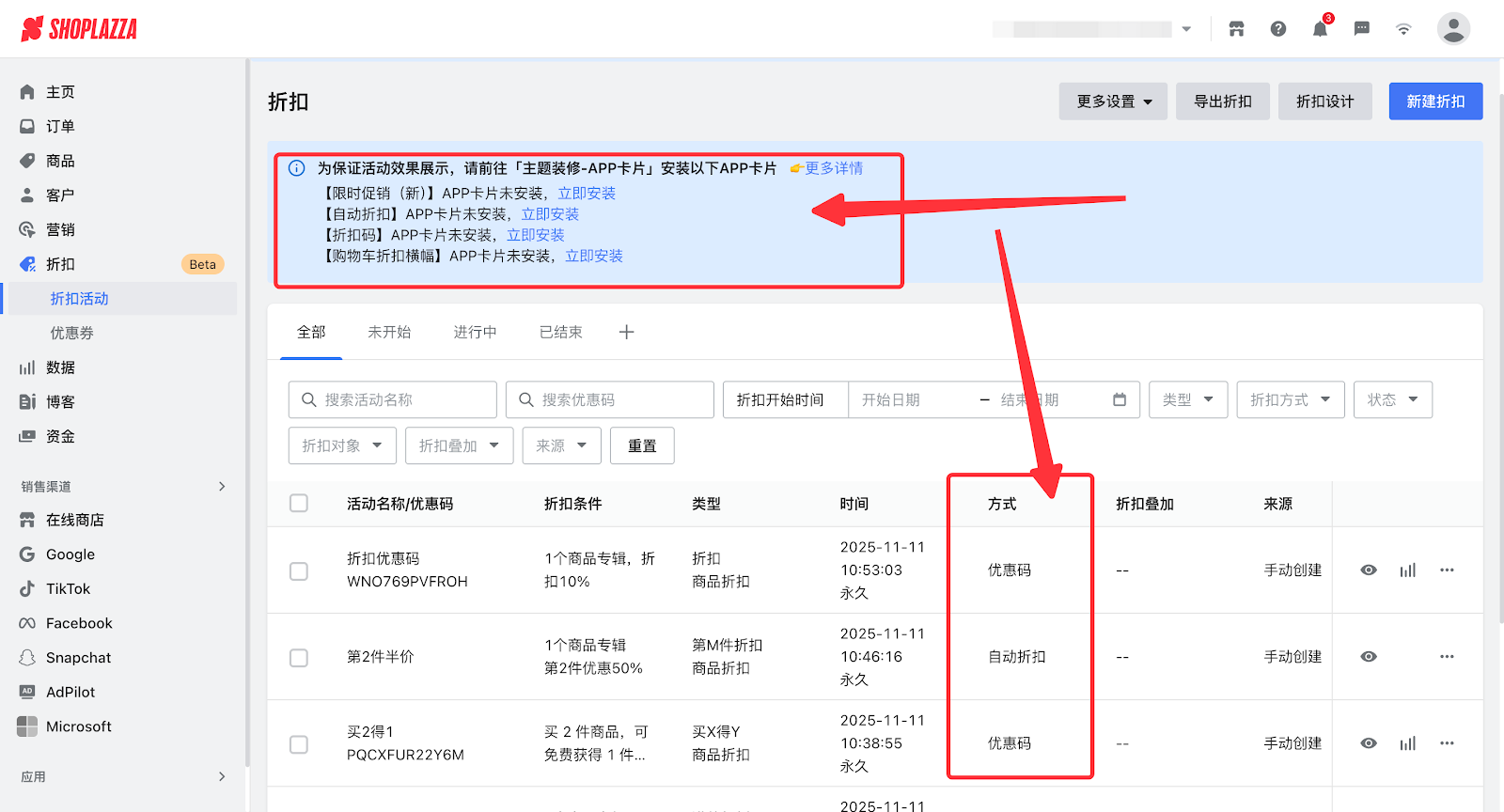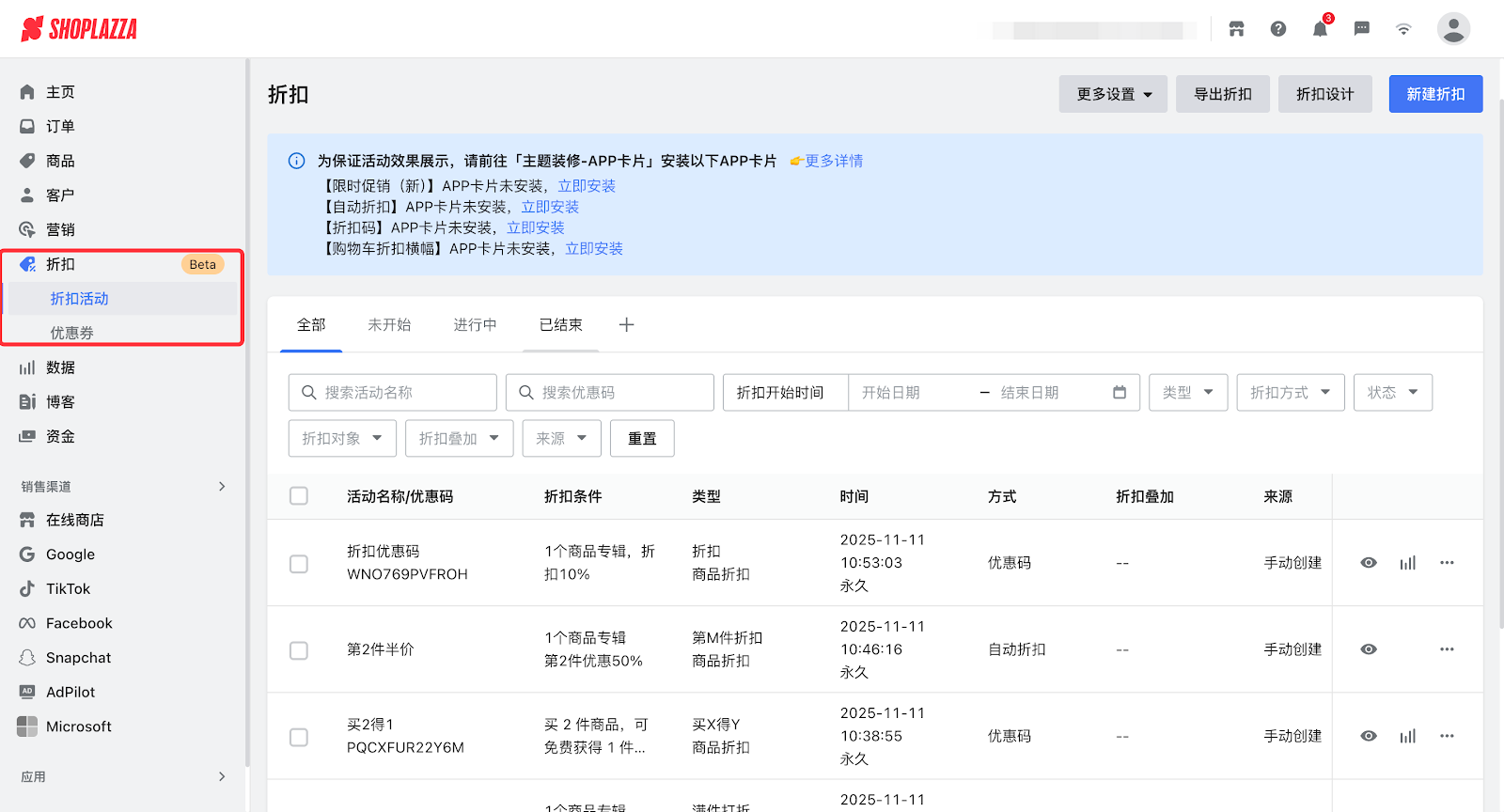 新版营销活动包括折扣活动模块的限时促销、满减、第M件折扣、优惠码、减价优惠码、买X得Y的活动,以及优惠券活动。