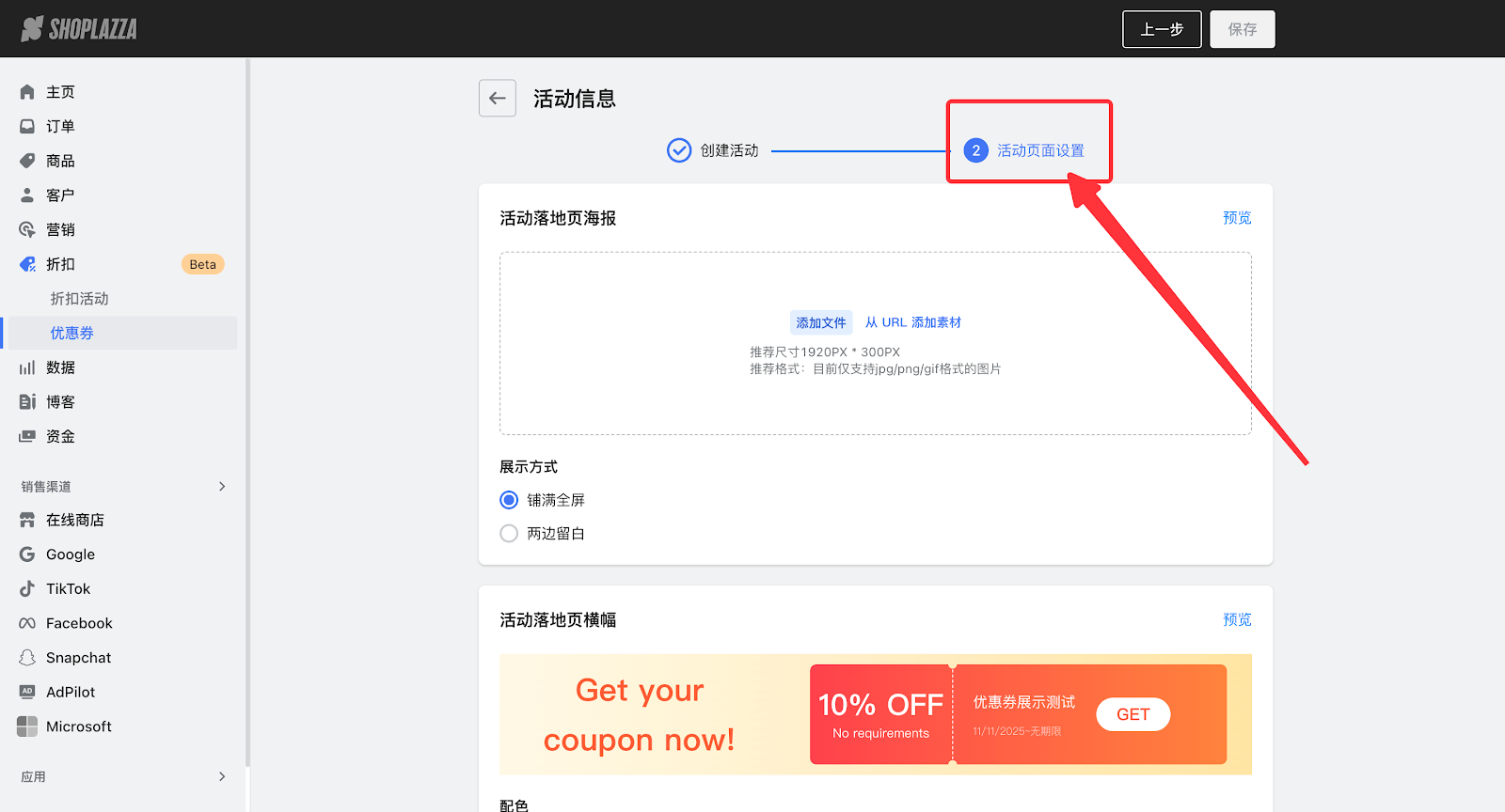 2. 进入优惠码活动详情页,点击活动页面设置。
