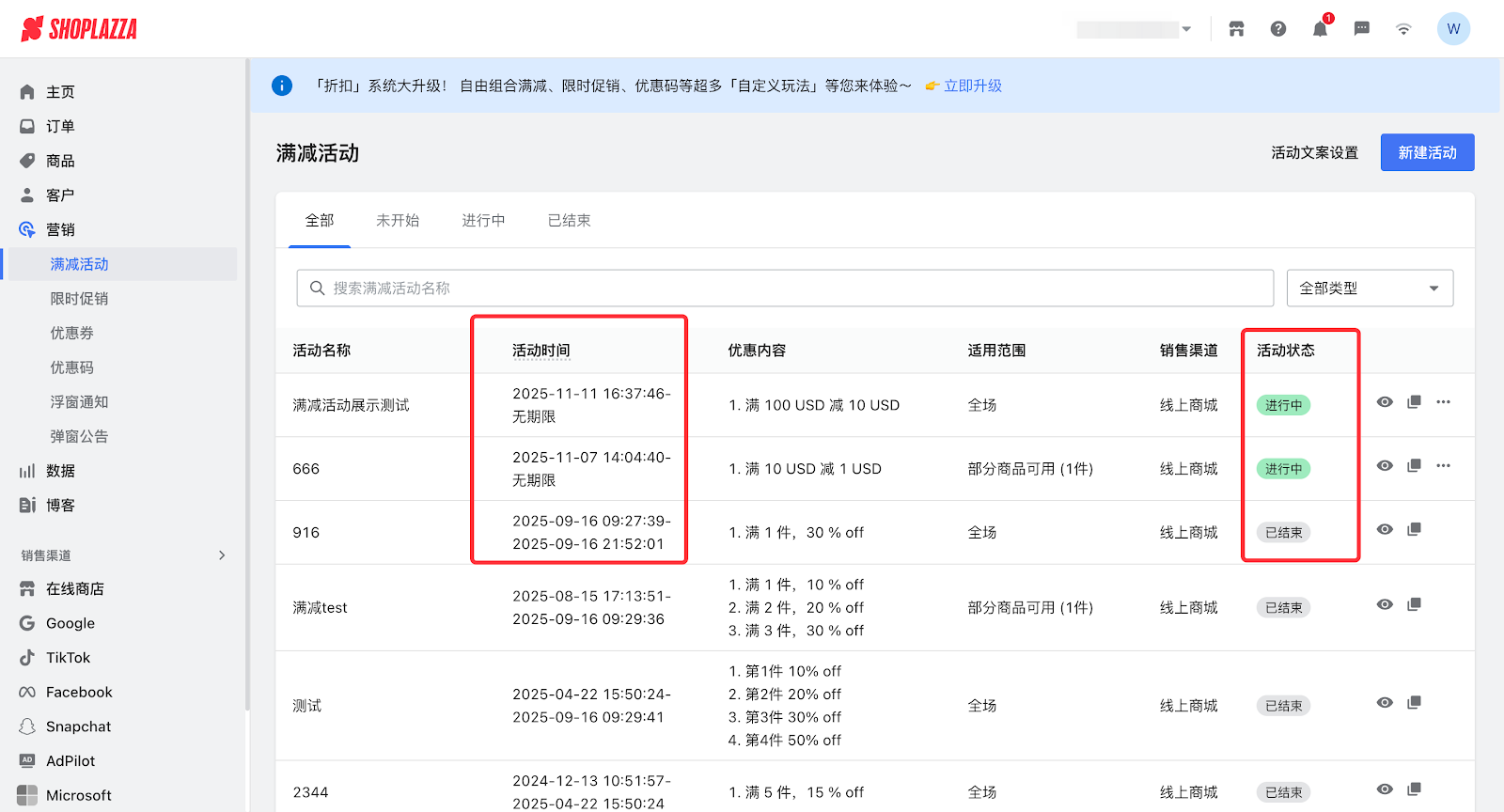 旧版的营销活动包括满减活动、限时促销、优惠券、优惠码的活动。