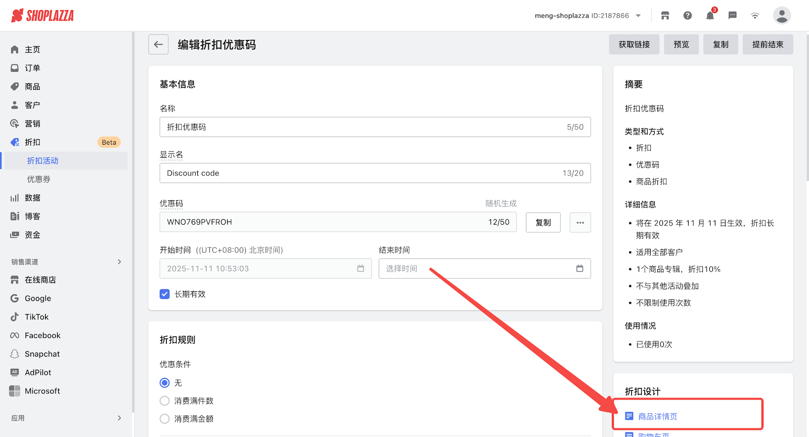 1. 登录您的Shoplazza管理后台,点击 折扣 > 折扣活动,选择活动,进入活动设置详情页。