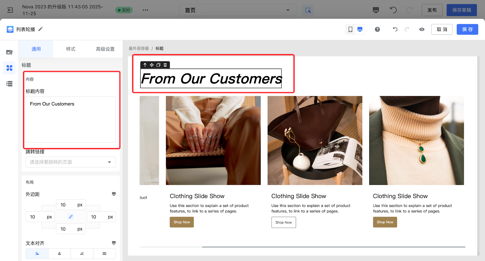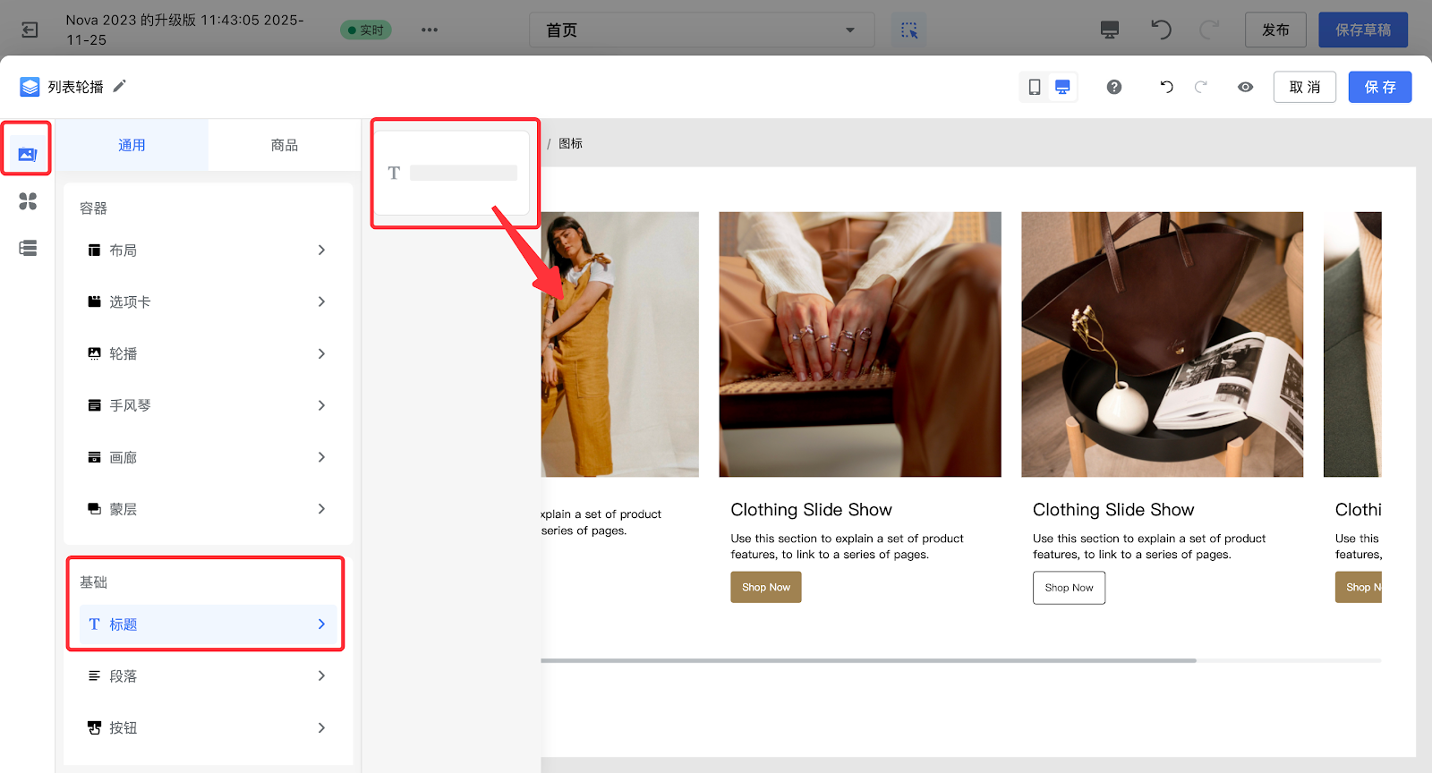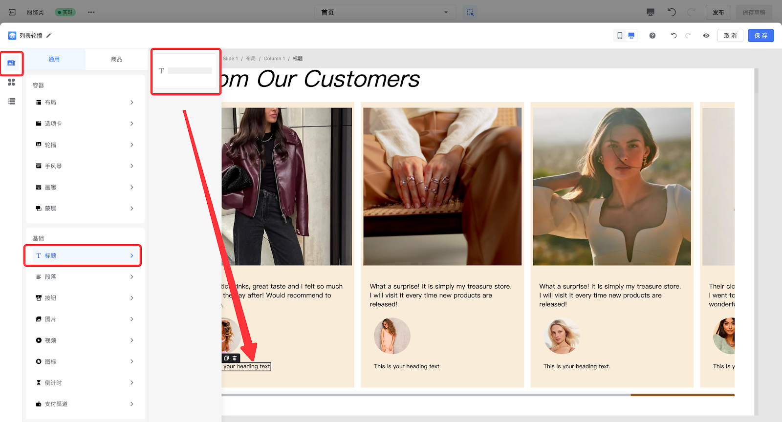 2. 在通用 > 基础 > 标题,将标题组件拖入卡片上方,为该板块配置一个标题,向客户说明此部分是买家秀展示。