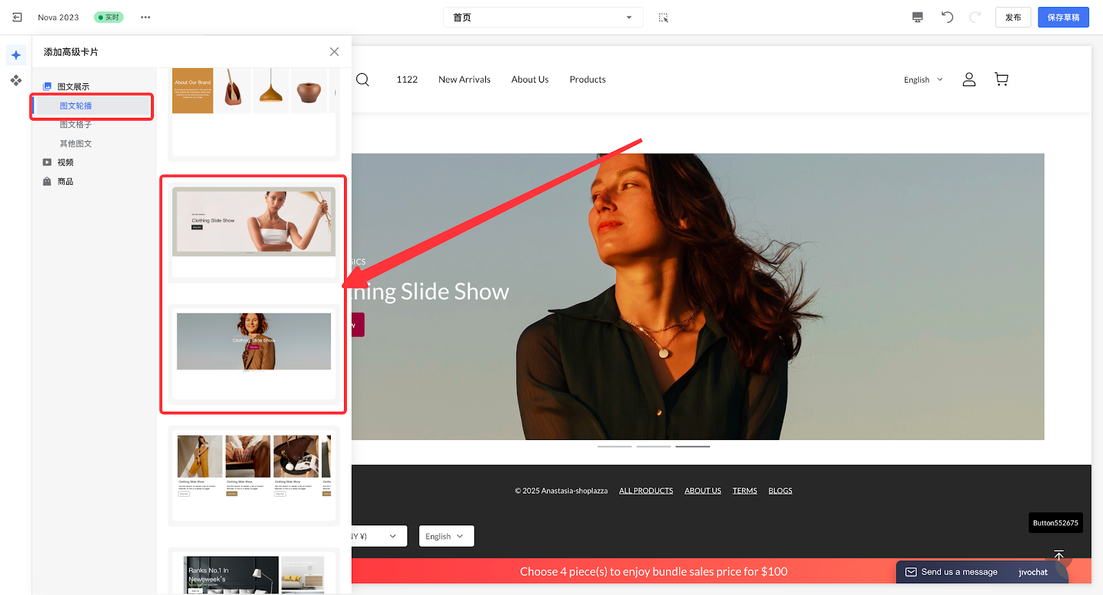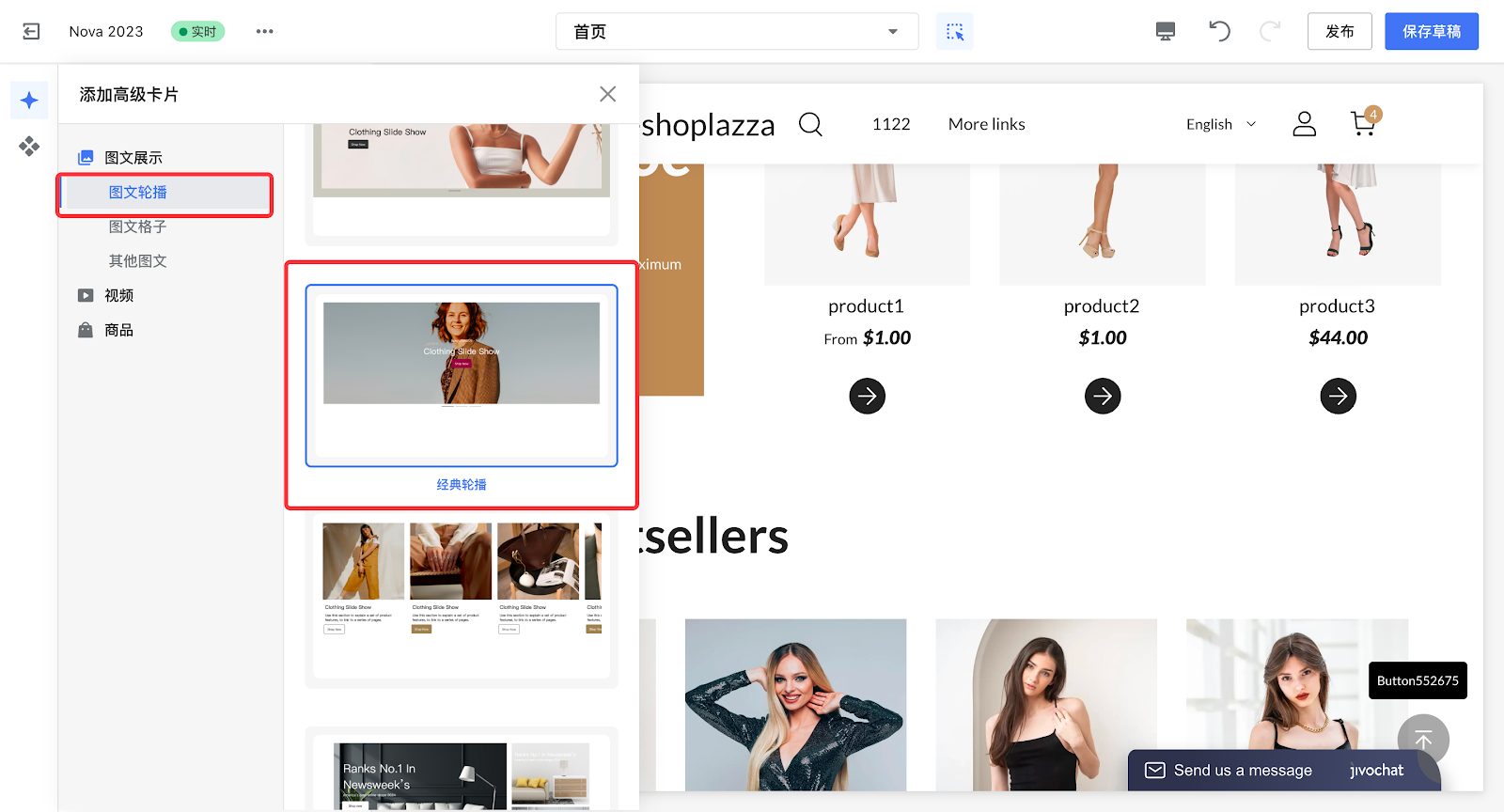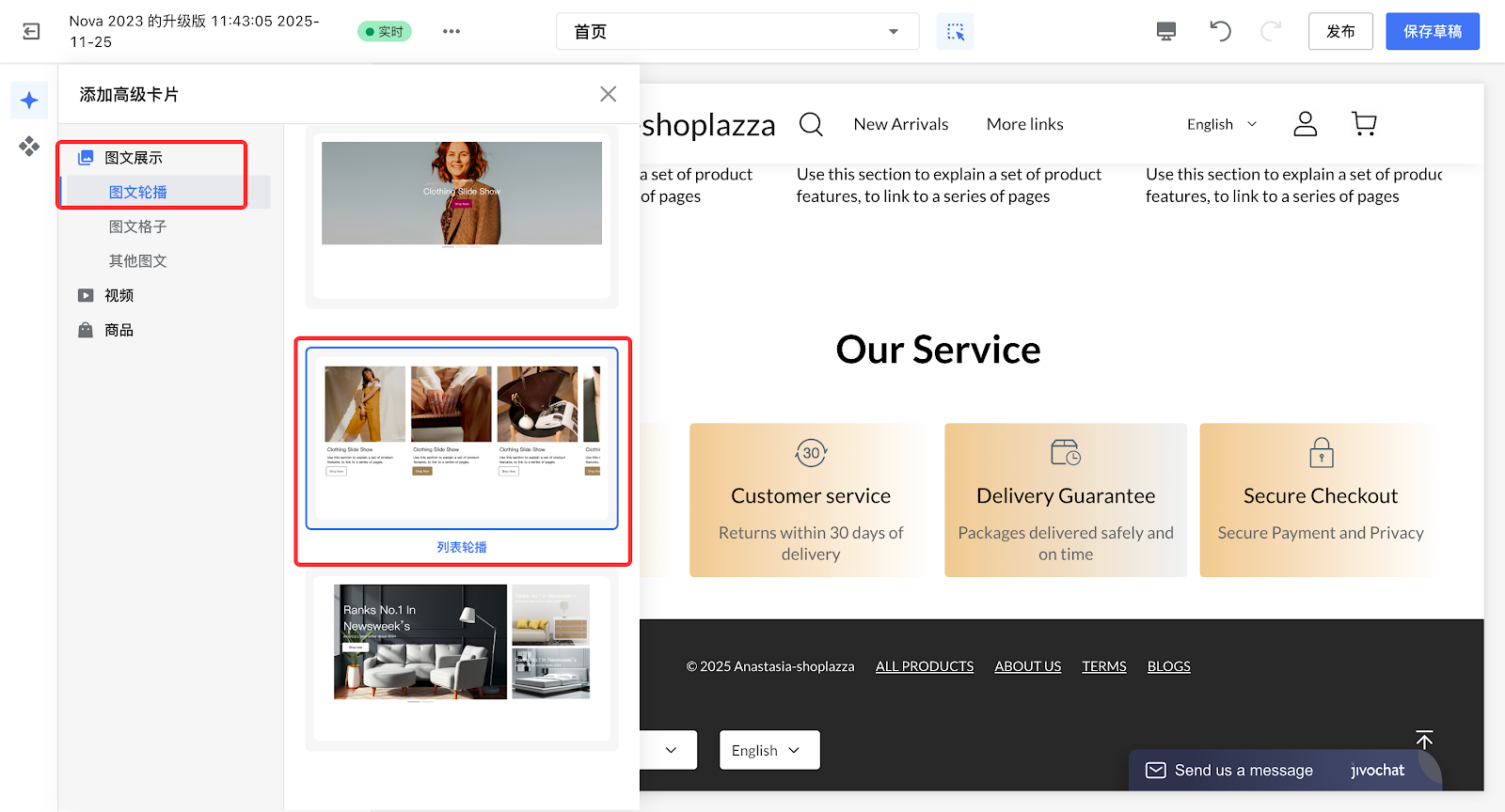 1. 点击图文展示 > 图文轮播,可选择列表轮播卡片配置一个买家秀的板块。