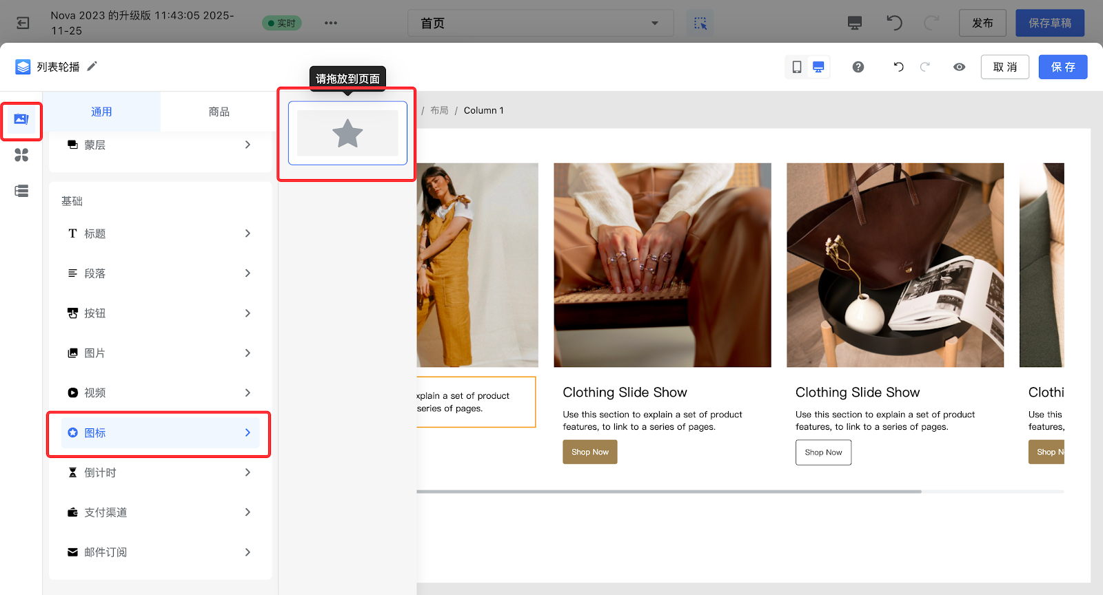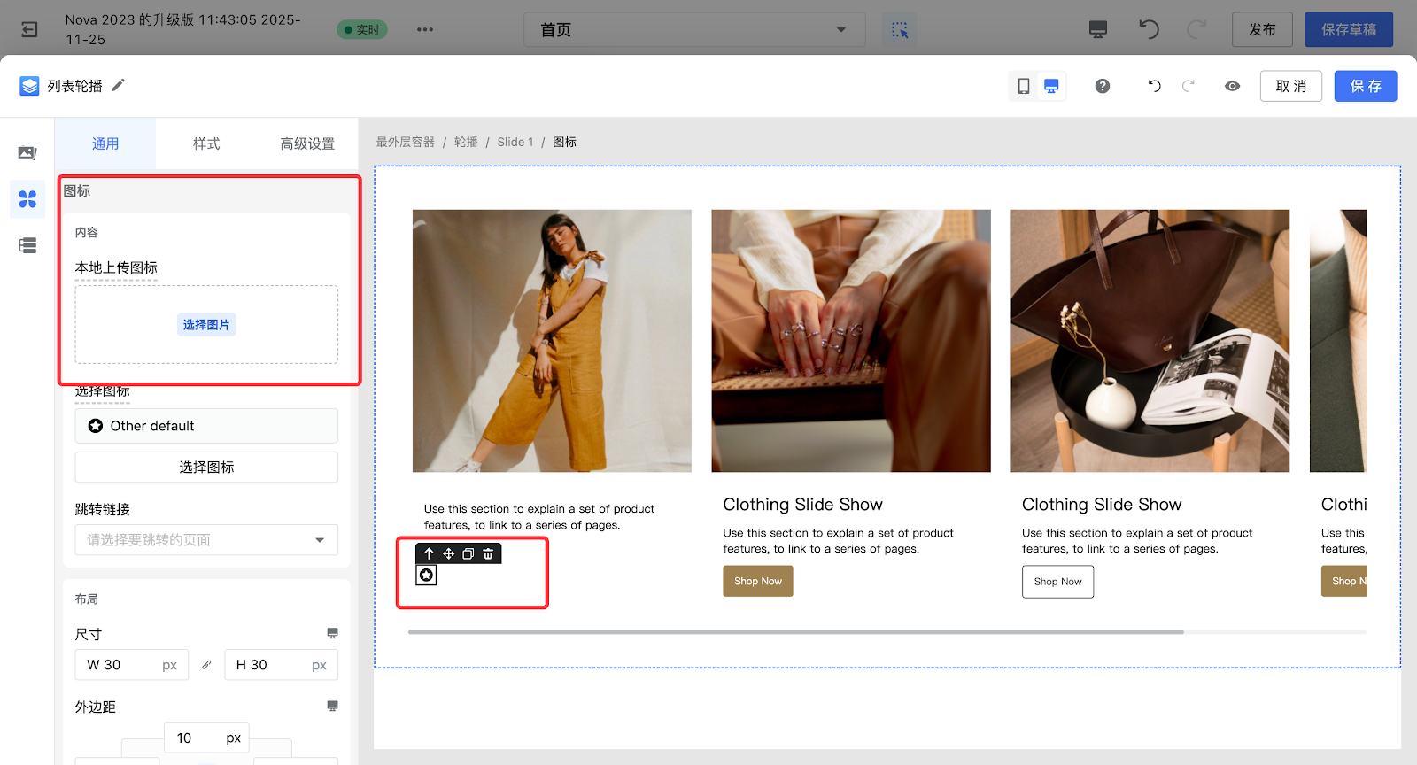 - 将图标拖动至页面中后,选中图标,点击选择图片上传客户头像;