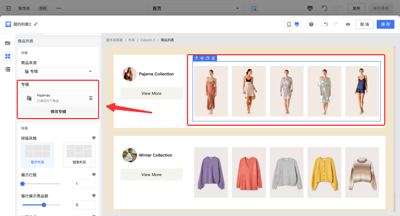 除了新品/热卖品的直观呈现,你可以选择按专辑维度(如 “睡衣系列”“冬装合集” 等)聚合展示商品,让主题商品呈现更规整、分类更清晰。