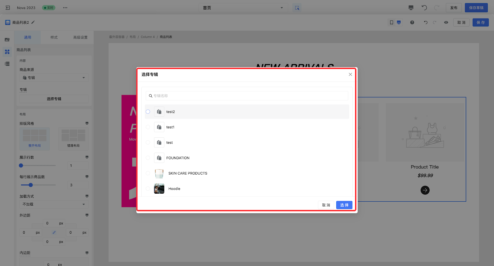 2. 选中商品部分为蓝色框,即可选择对应专辑关联展示商品。