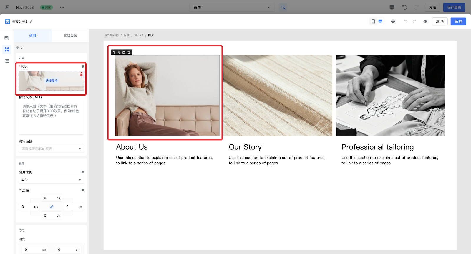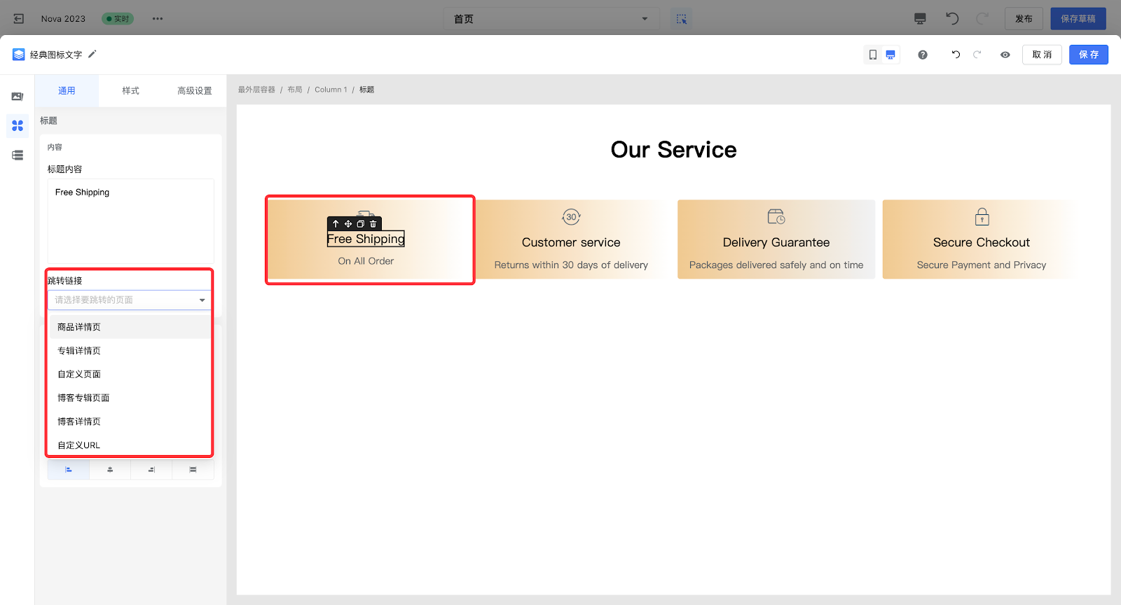 2. 选中图片部分可以替换图片,同时可为图片关联自定义页面或博客等跳转页面,引导客户点击跳转查看更详细的信息。