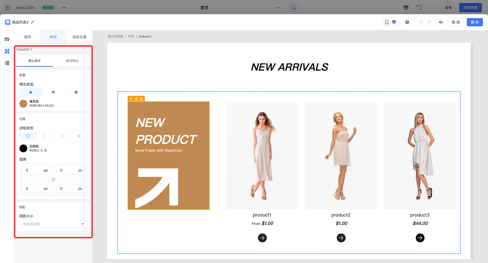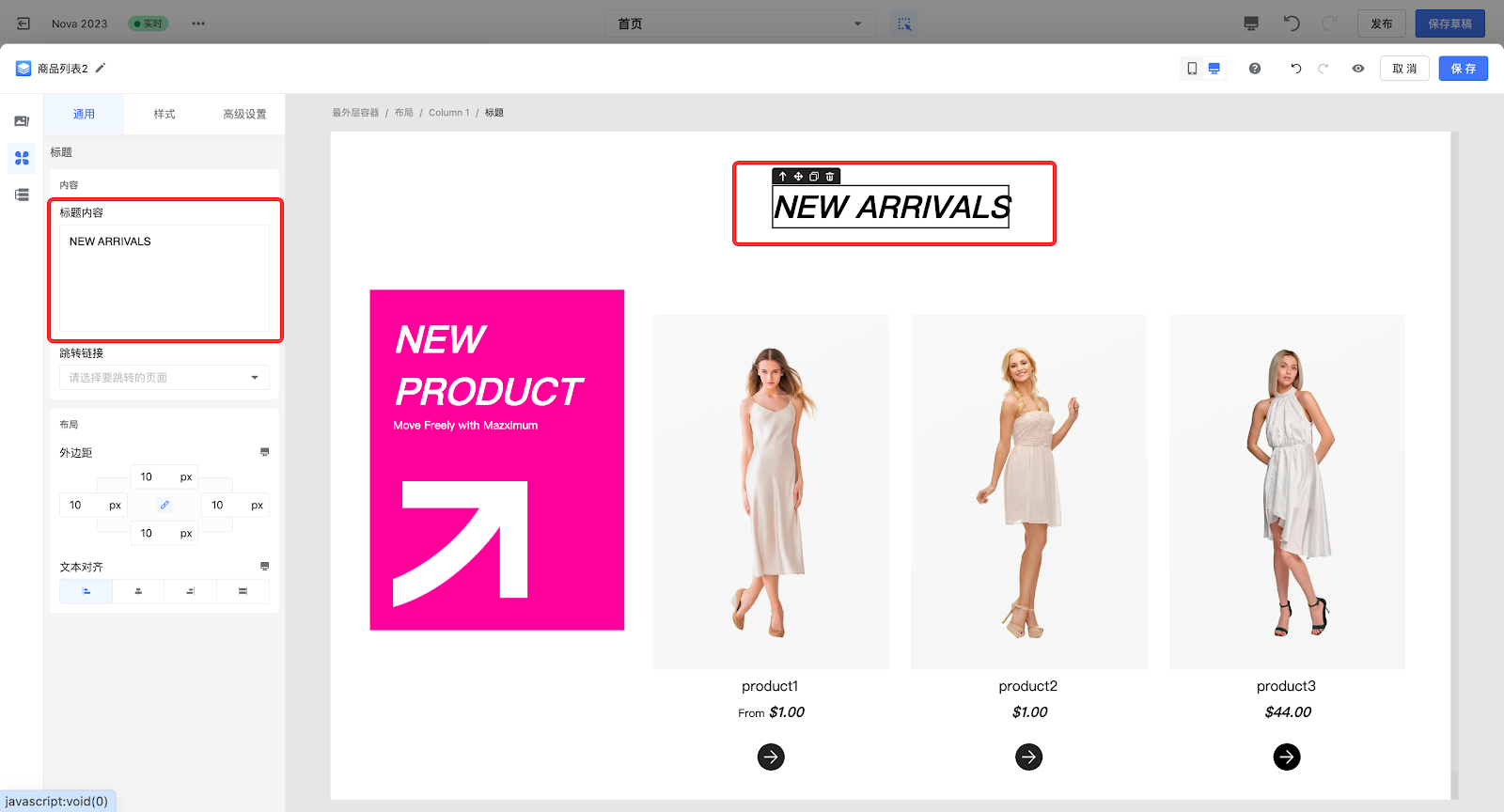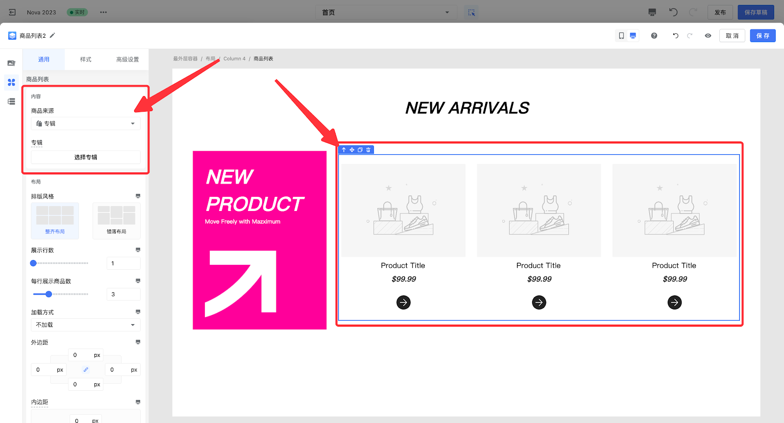 为了让新品/热卖品的呈现更直观吸睛,可以选择自带新品导视图与商品关联区域的商品列表2卡片进行配置。