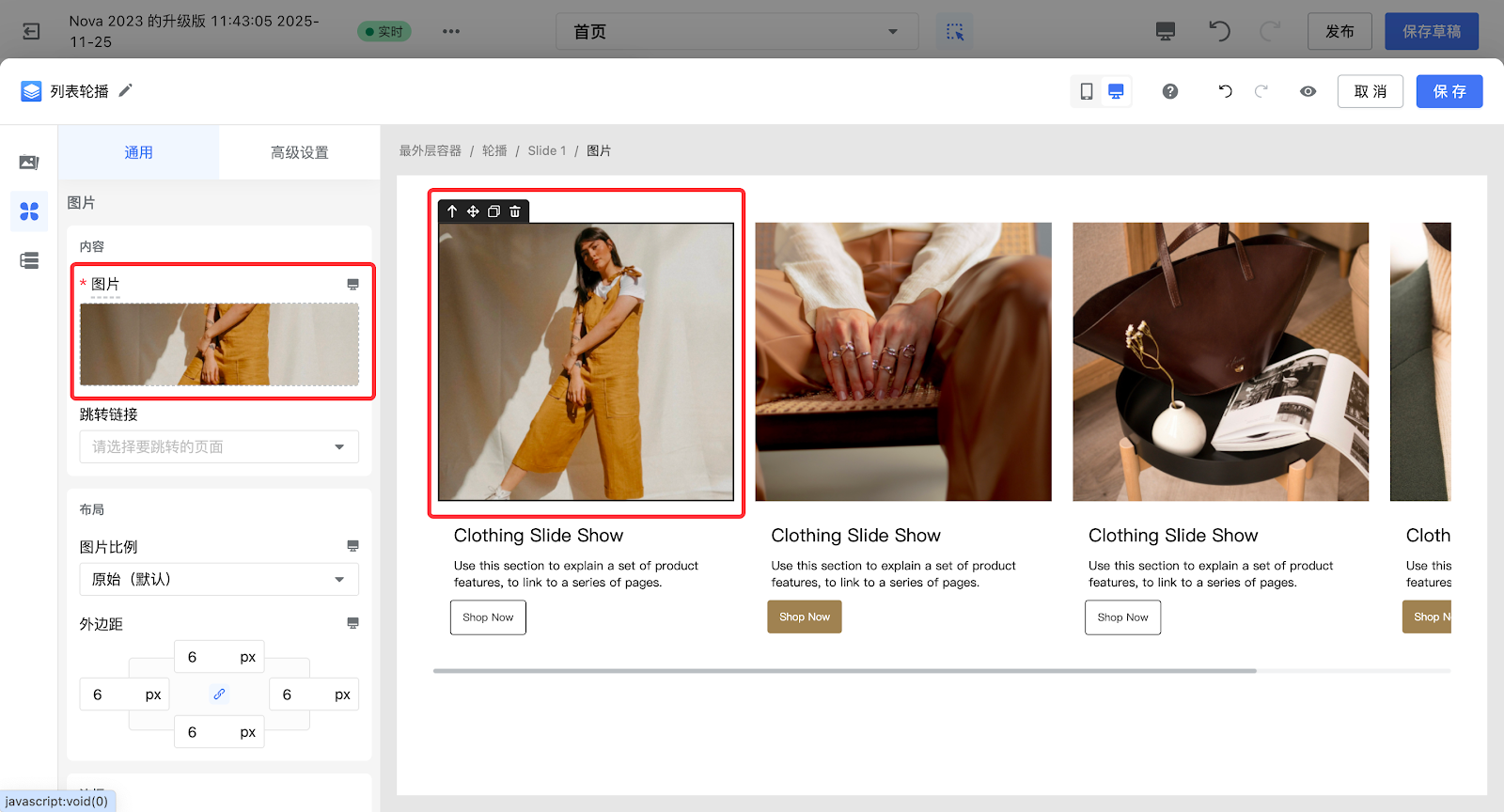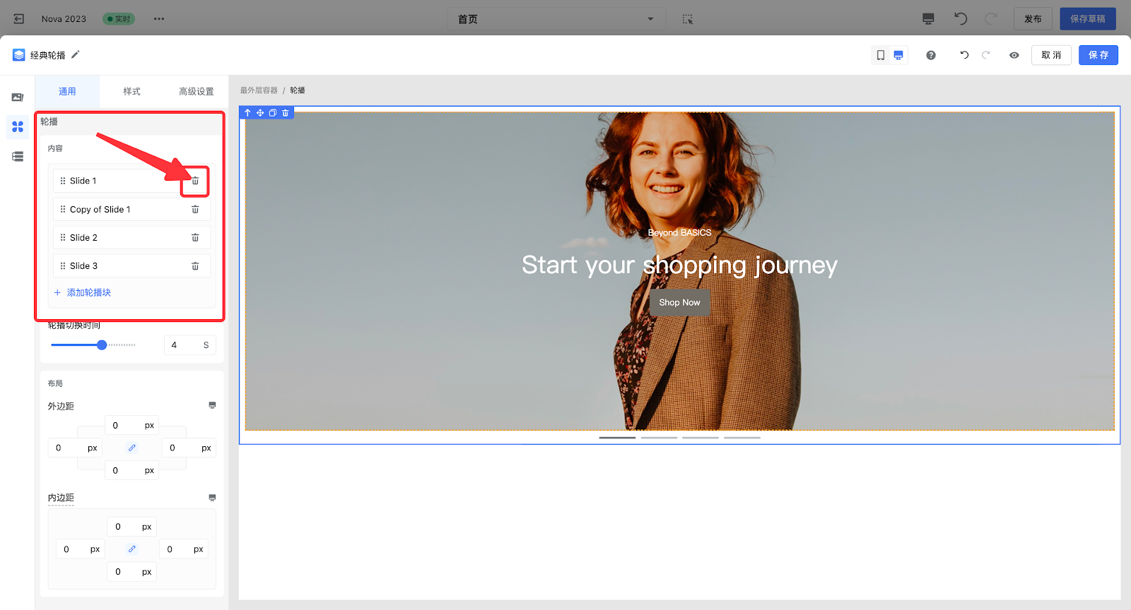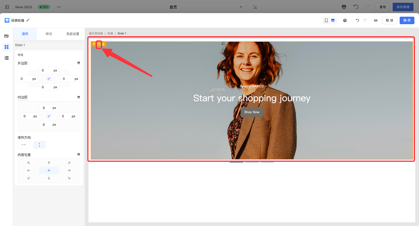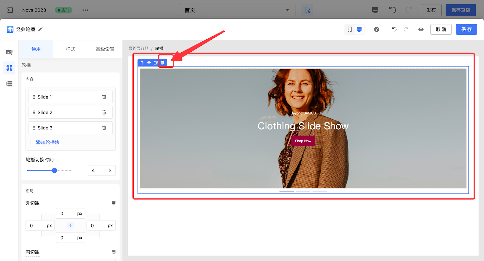 6. 如果只需要显示一张 banner,可选中整个轮播卡片为蓝色框,在左侧工具栏里进行删除。