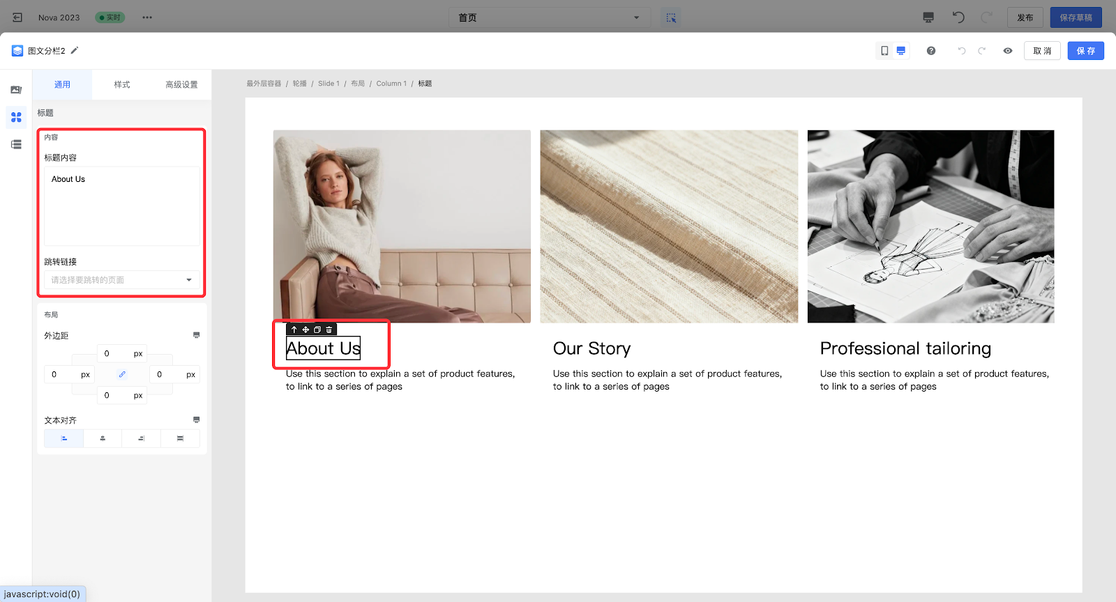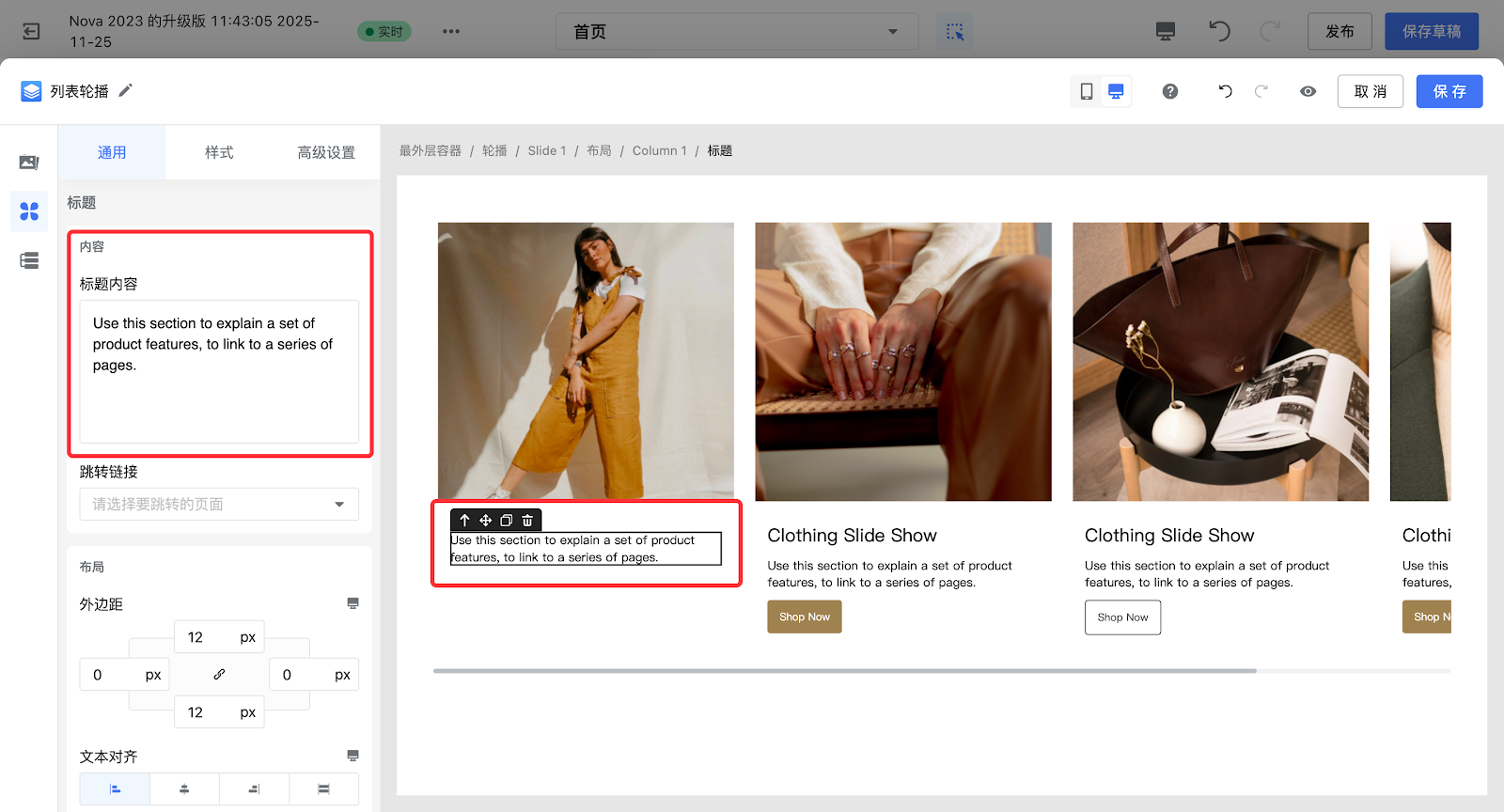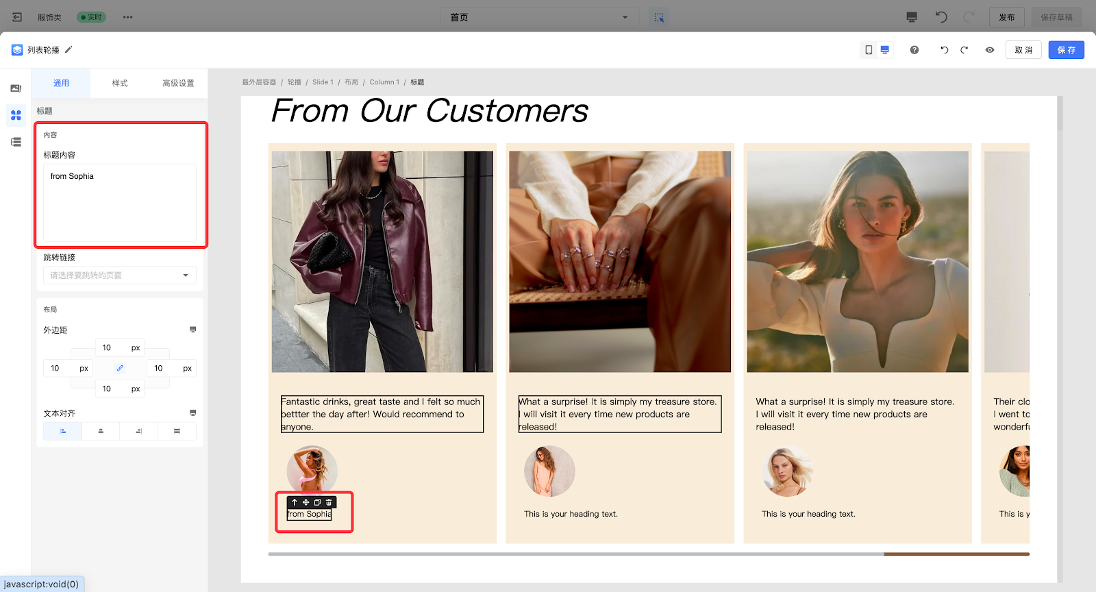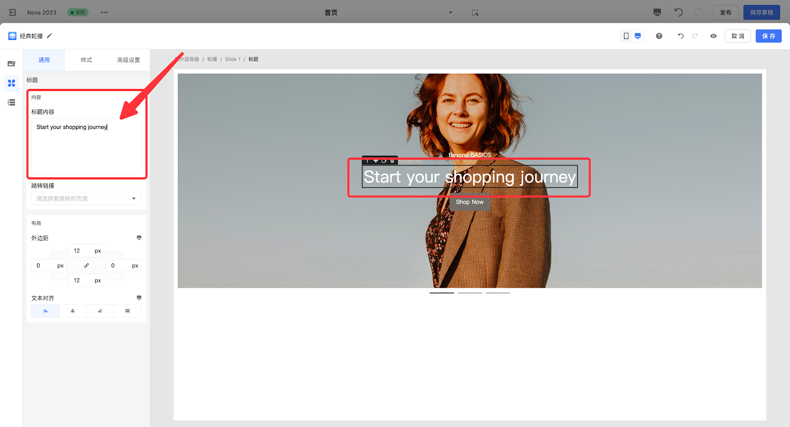 - 设置 banner 标语,根据不同的展示需要,选中标题部分,即可在左侧工具栏修改你的 banner 标语。