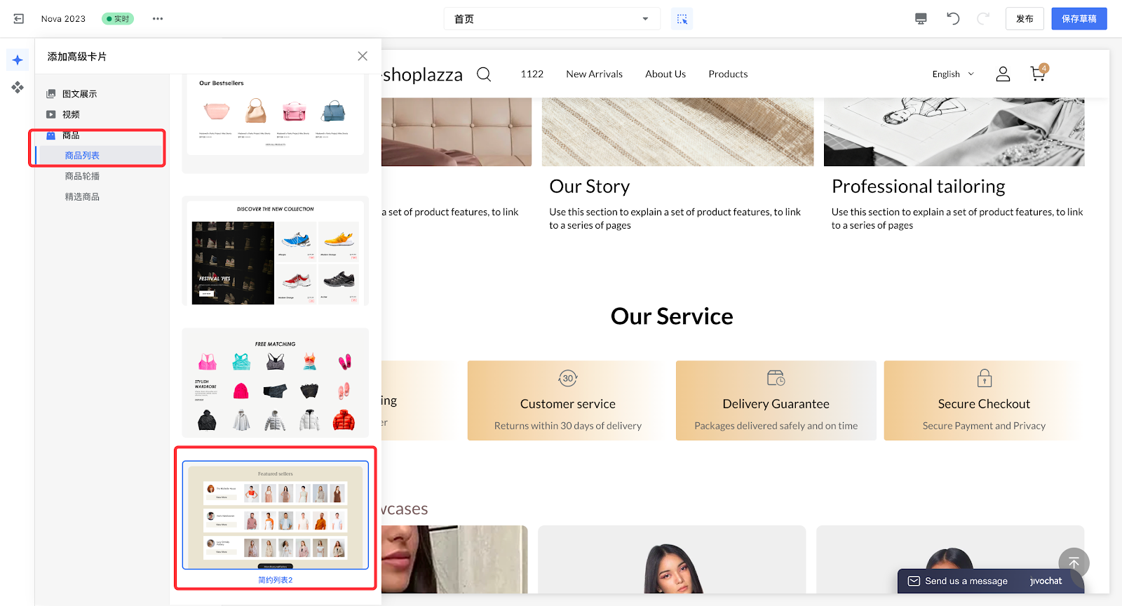 设置完成 banner 后,还需要向客户直观展示你店铺内所售卖的产品,在高级卡片广场中同样预设了多样化的商品类的卡片,通常可以选择商品列表1、商品列表2来配置热卖商品、新品板块等。对于服饰来说,消费者更在意服装的上身效果,因此更建议选用有真实模特上身的商品素材,激发客户点击查看产品详情的欲望。