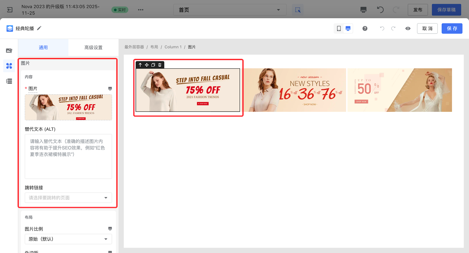 3. 点击图片组件,即可在左侧工具栏上传活动 banner,同时需要为每个 banner 关联活动跳转链接,以便客户更好地查看各活动详情。