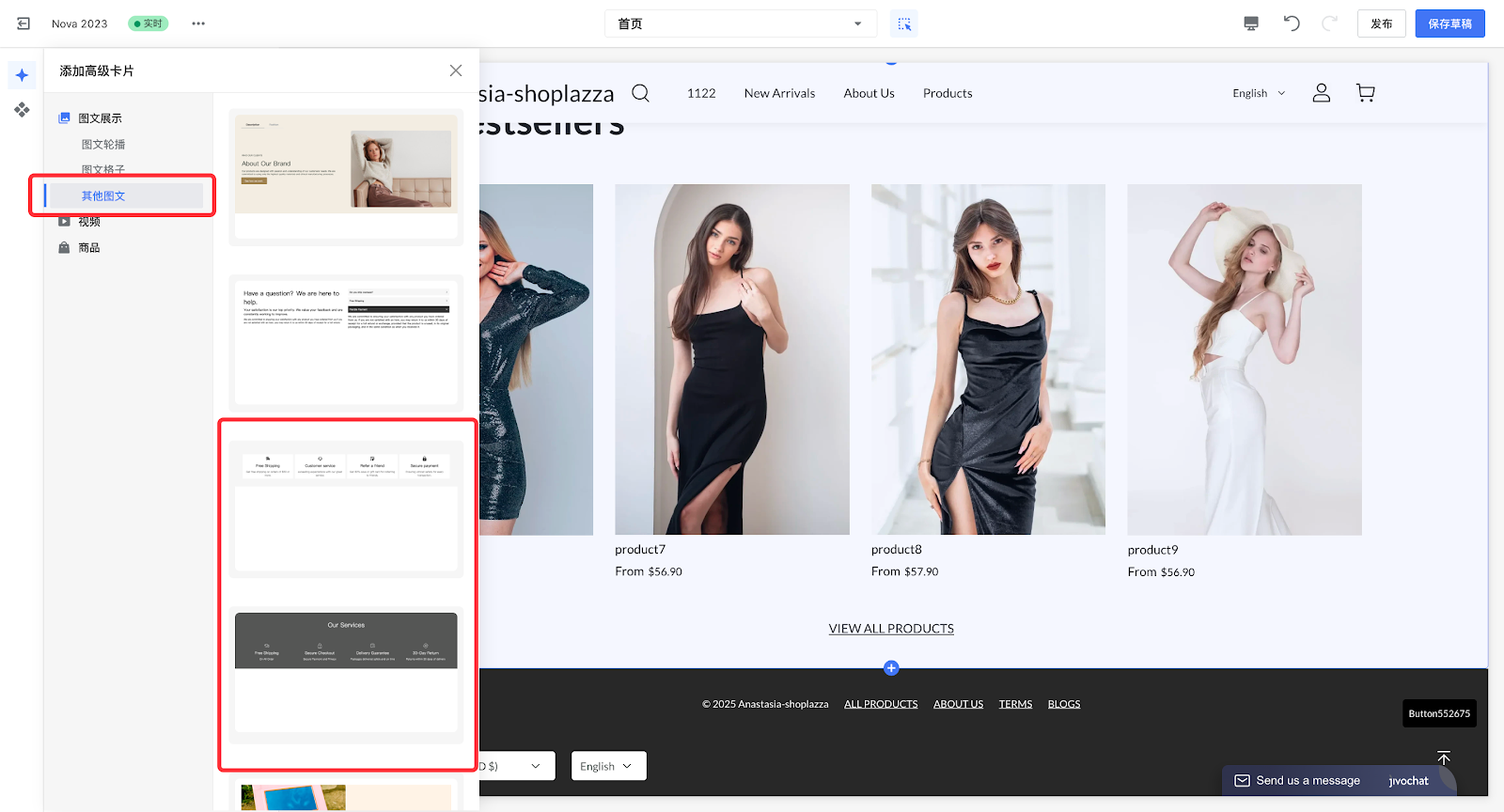 1. 在高级卡片中可以选用图标文字类的卡片进行简单的说明介绍,选择图文展示 > 其他图文,可看到已预设好的图标文字,可以直接进行编辑。