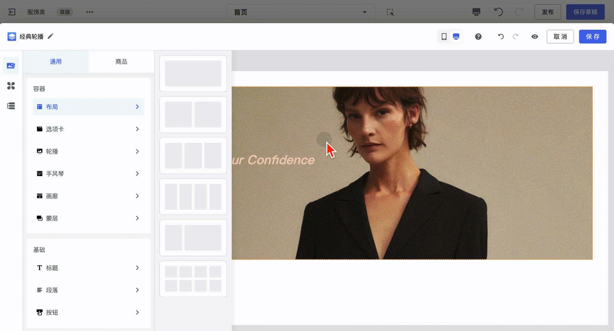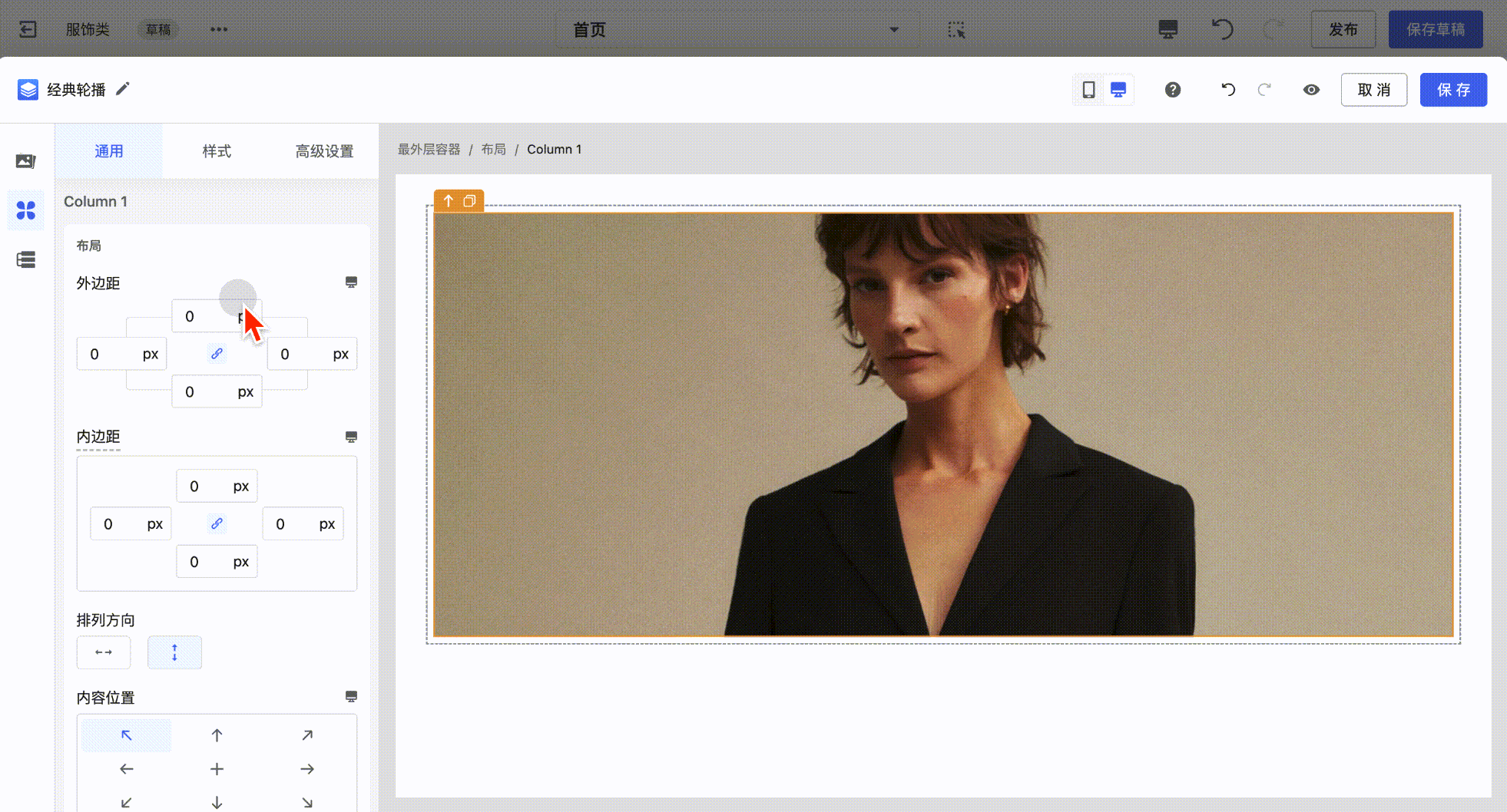 3. 此时可以点击组件 > 布局 > 选择单一布局,长按拖动至页面进行配置,选中布局为黄色框,点击样式,将背景填充设置为图片,选择你需要的 banner 上传。