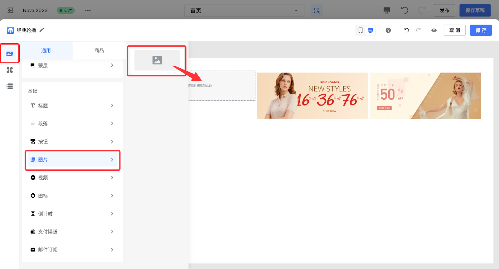 2. 在通用 > 图片,选中图片组件,将其依次拖放至布局容器内,即可上传在布局内上传图片。