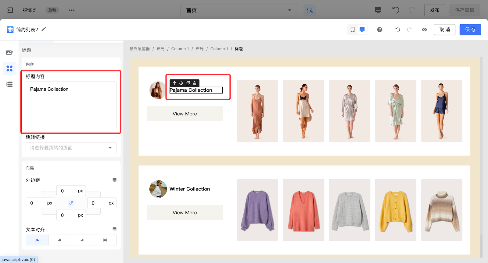 3. 点击页面中的标题组件,可为该部分商品设置对应品类标题。