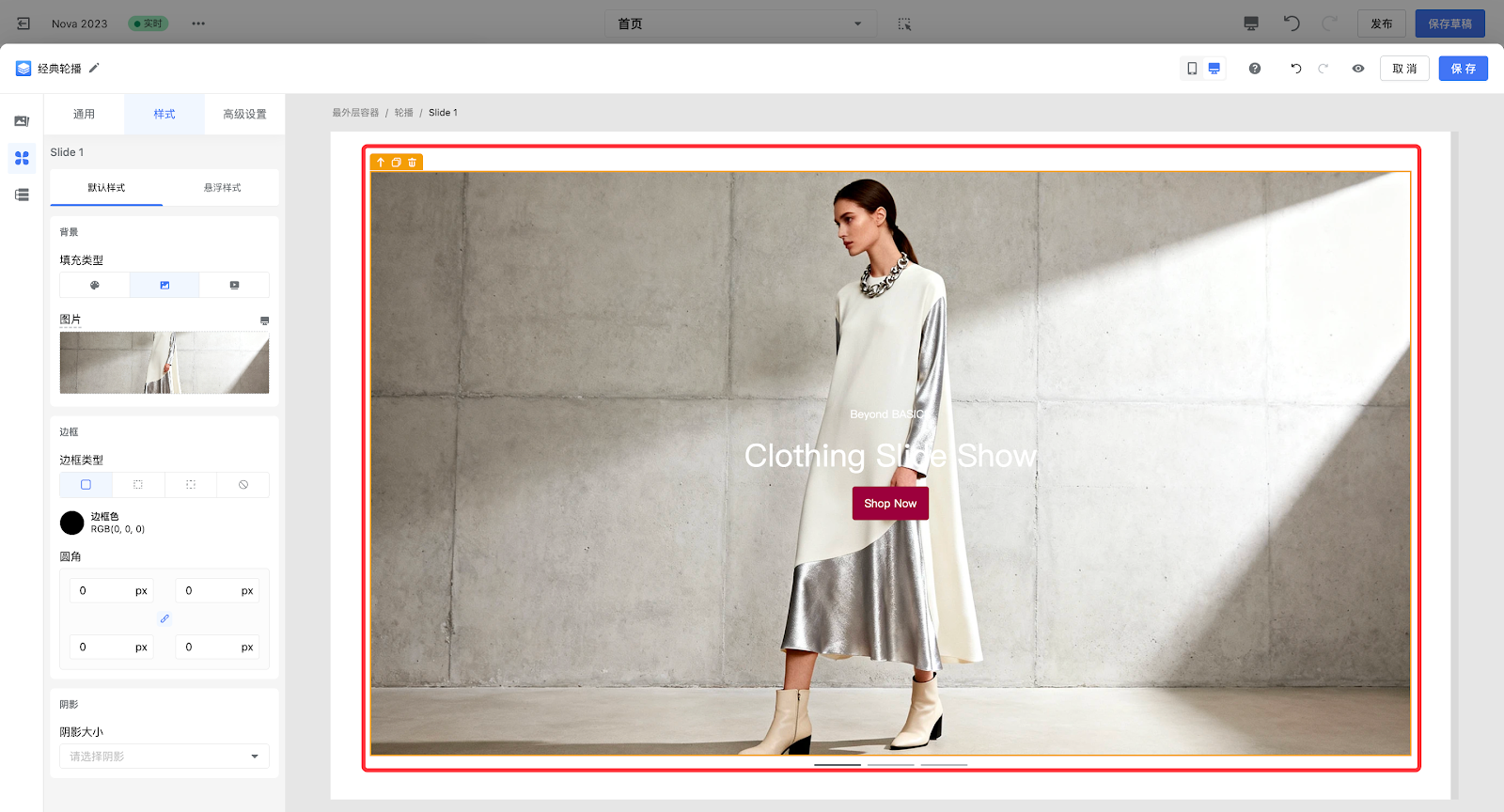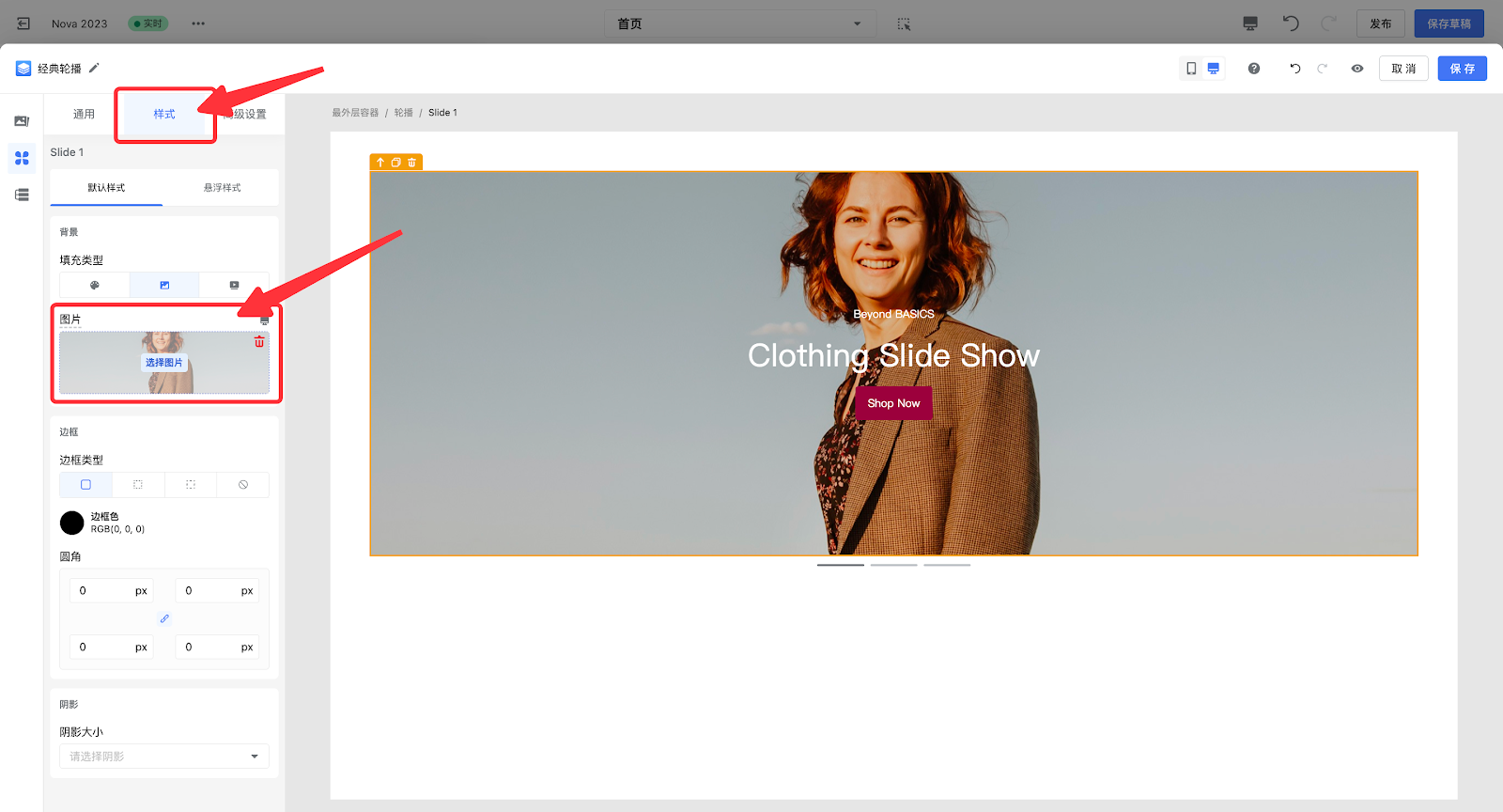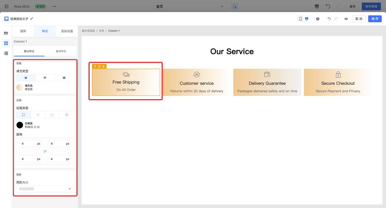4. 装饰性的视觉引导部分也需要同样符合品牌整体调性来进行调整,选中右侧对应的组件,点击样式,即可修改其背景、边框和阴影部分。