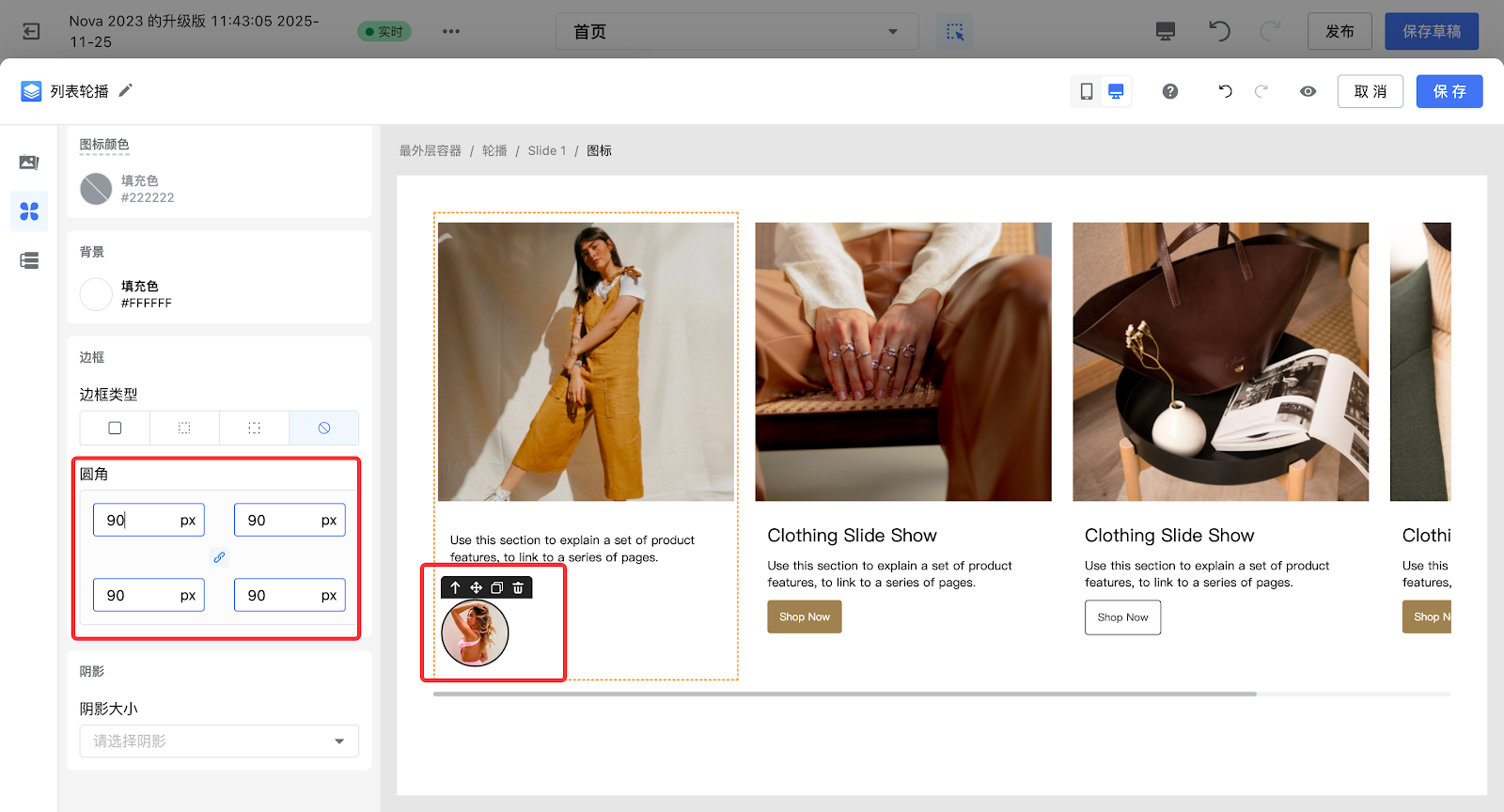 选中头像可设置其尺寸大小,点击样式板块还可为其设置圆角。