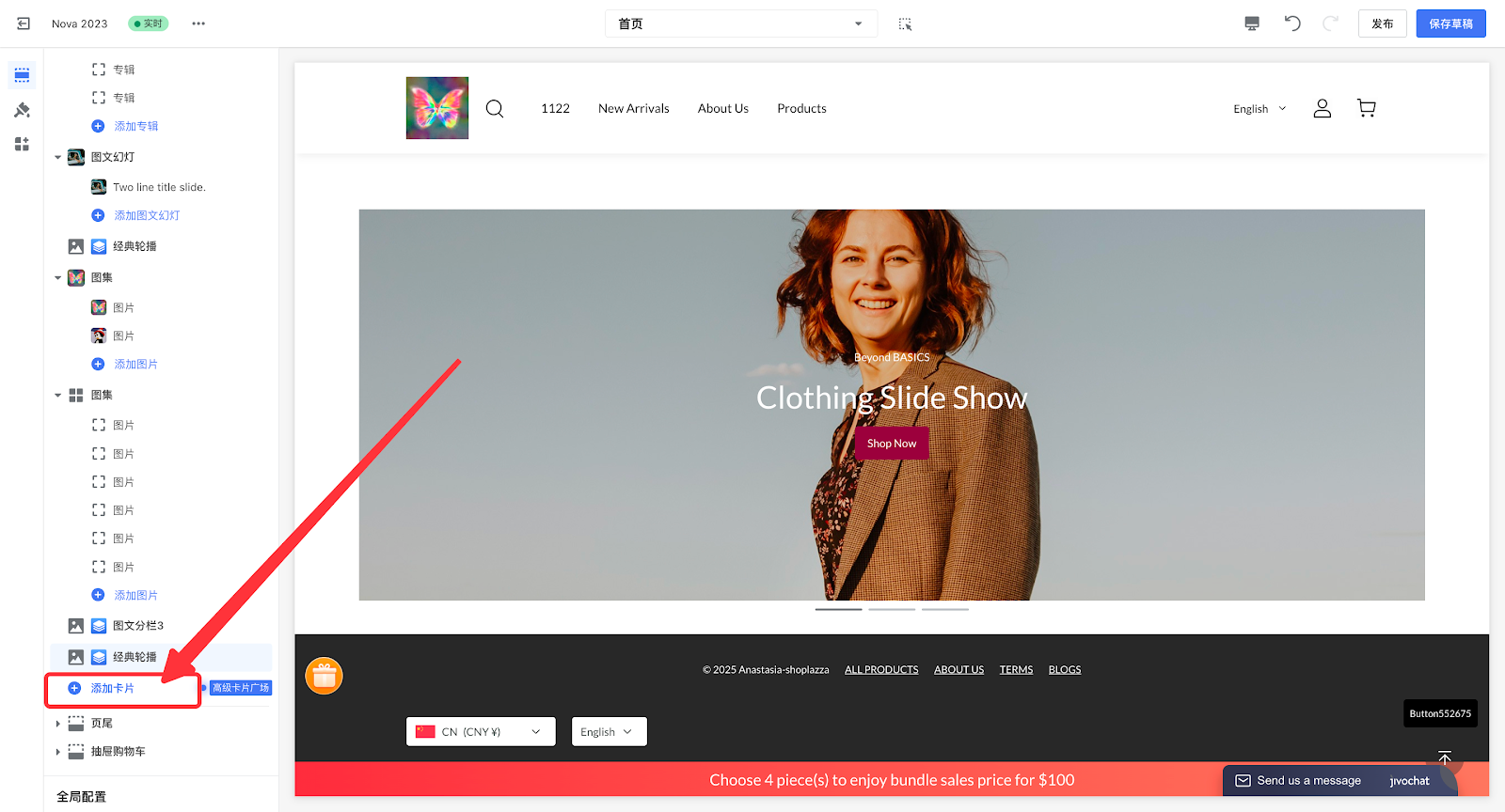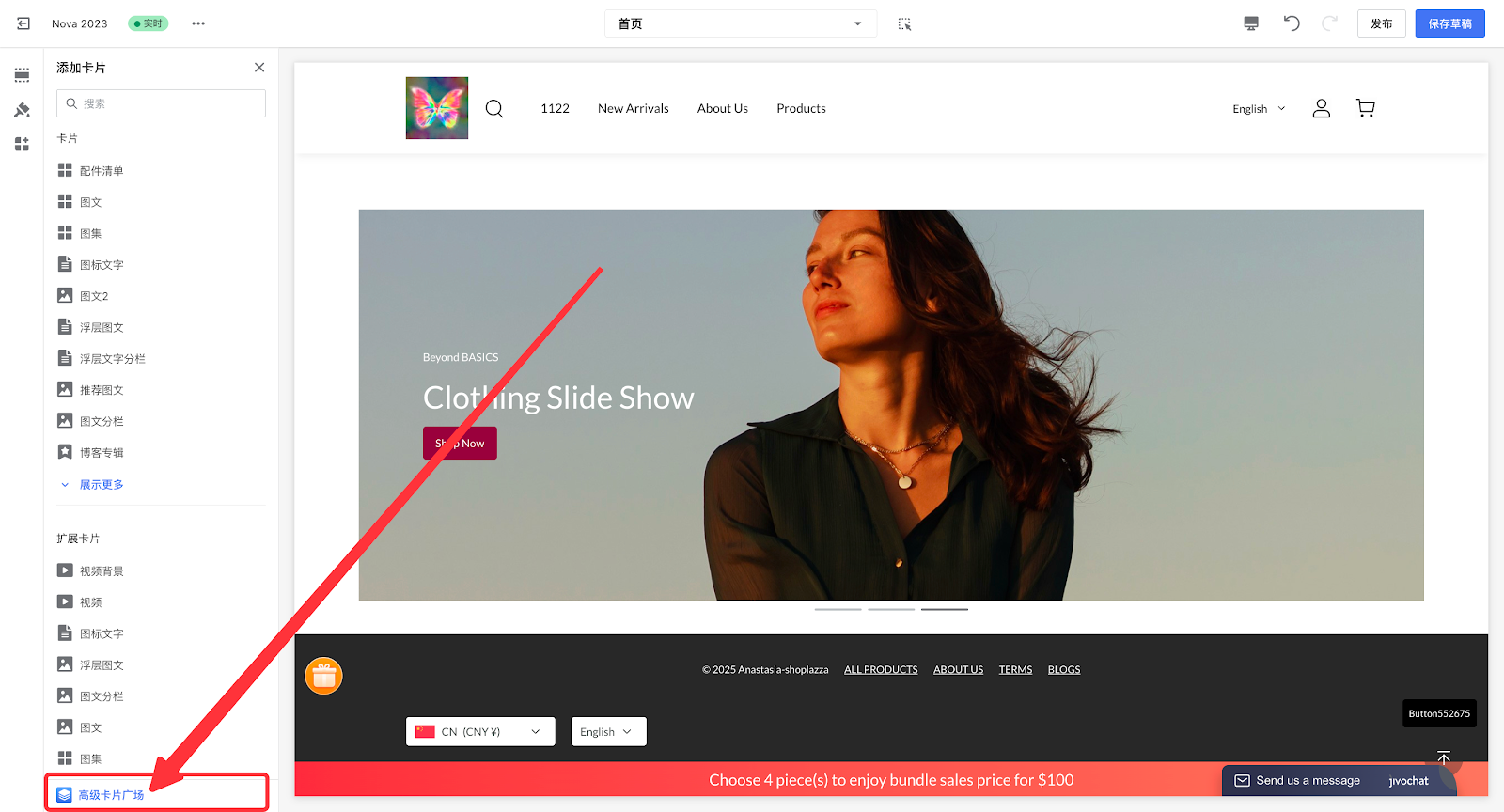 登录你的 Shoplazza 管理后台,点击在线商店 > 主题装修 > 编辑,进入到主题编辑器,将左侧面板的卡片列表下滑至底部,点击添加卡片按钮,在二级面板中点击入口高级卡片广场。