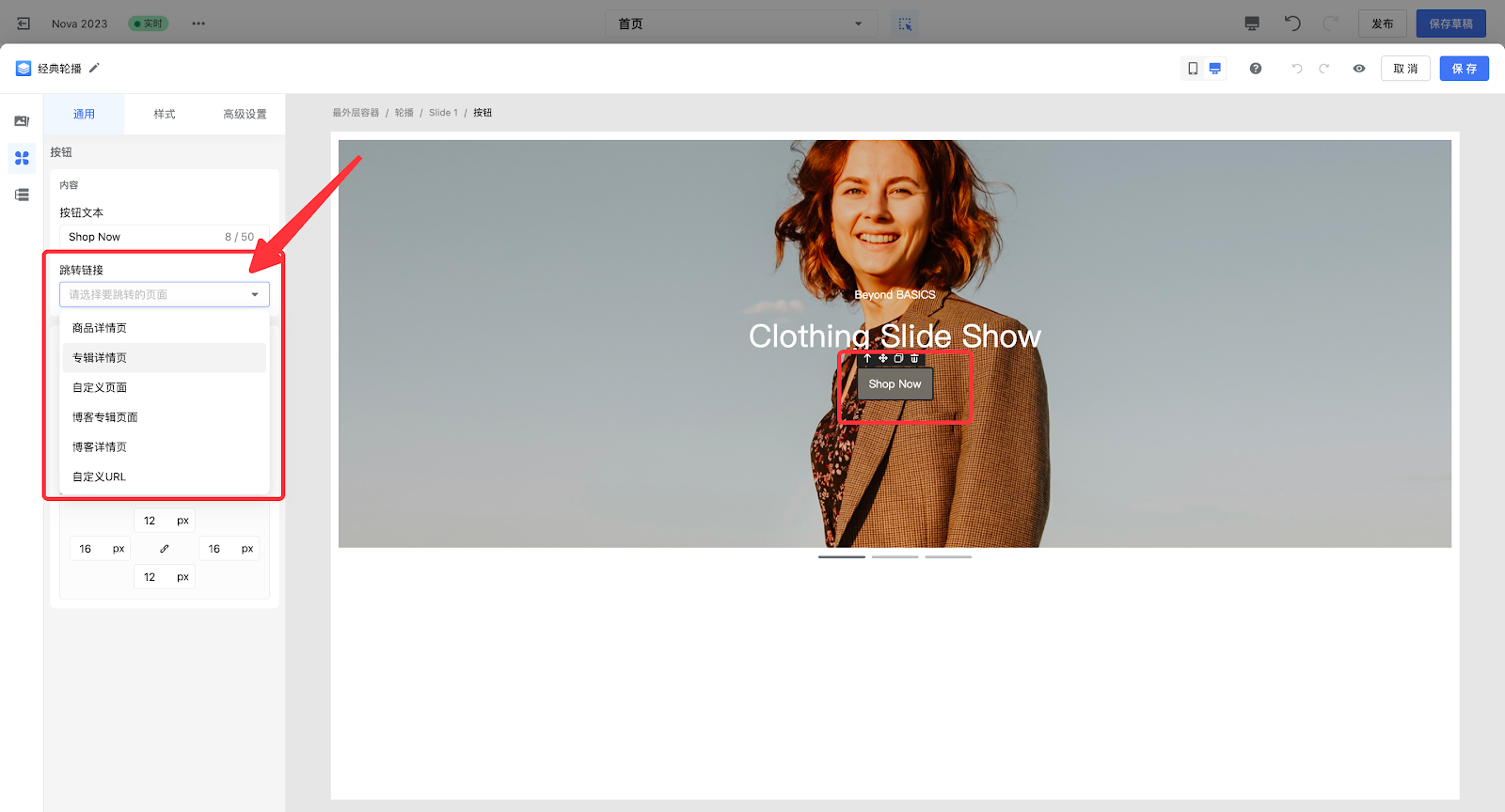 banner 中的按钮可以链接至你店铺的热卖专辑或任何你希望客户能够直接点击查看的专辑、商品链接,选中按钮,即可为按钮设置跳转连接到你需要的页面。