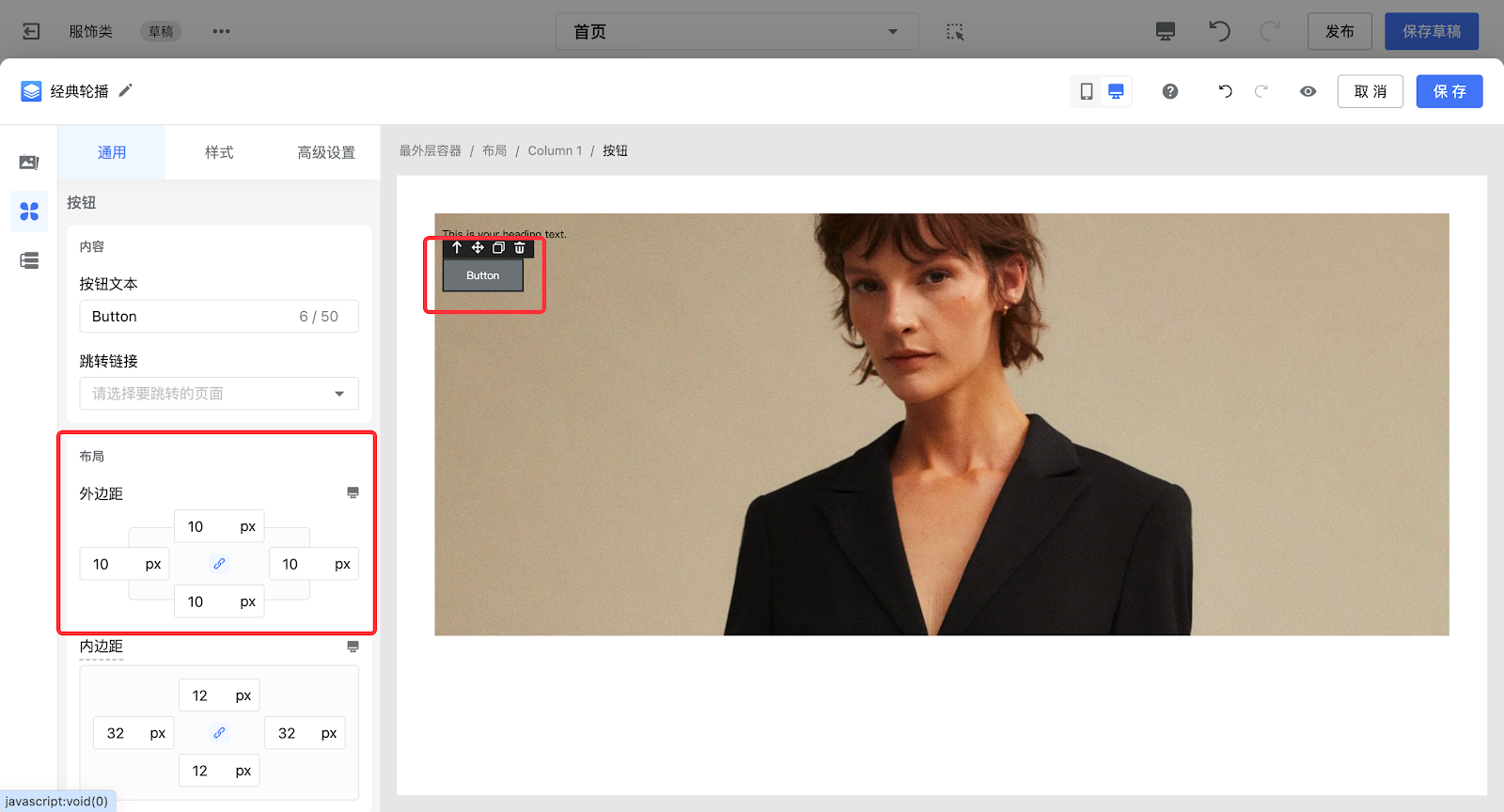 5. 如果觉得组件位置不合适,可选中组件点击通用,通过外边距来进行组件位置的调节。