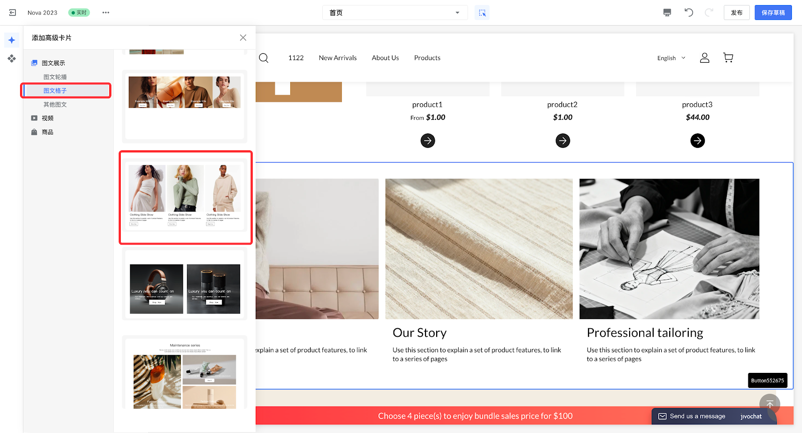 1. 可以选用图文格子中的图文分栏卡片,通过配图和文字简单介绍服饰所使用的面料,剪裁等工艺,以加强客户对你品牌的了解,展现对商品生产的专业把控。