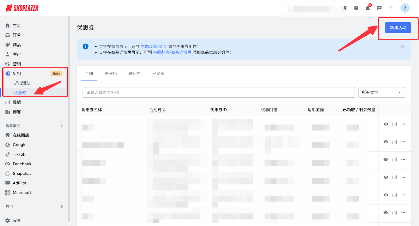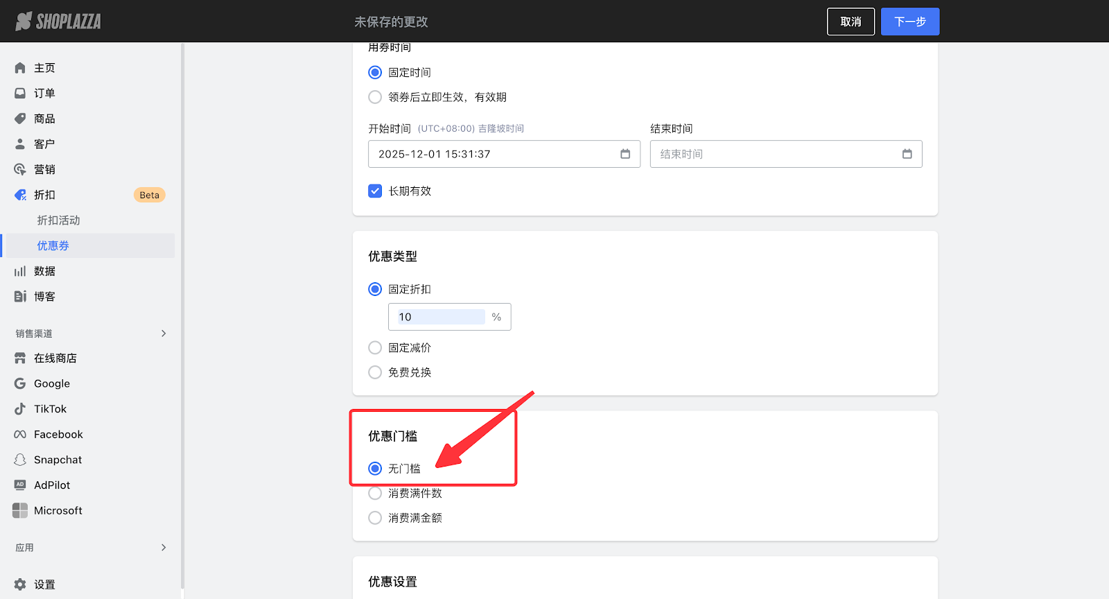 1. 登录 Shoplazza 管理后台,进入折扣 > 优惠券。将优惠门槛设置为无门槛。