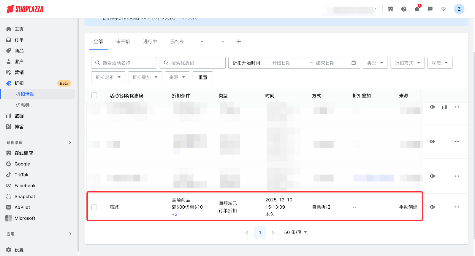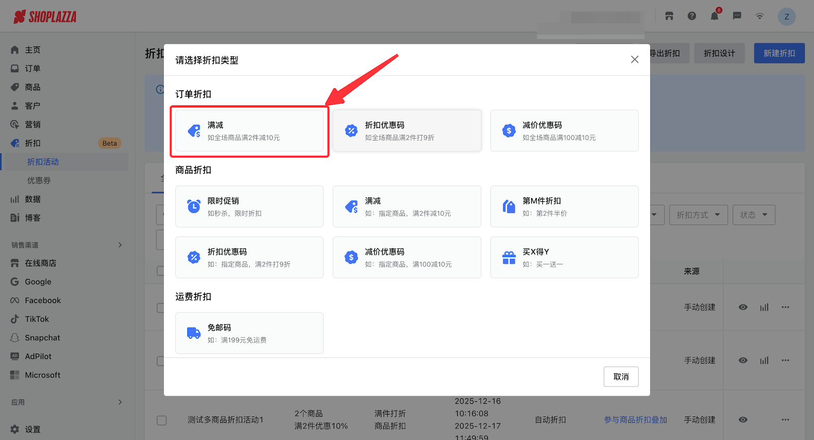 1. 登录 Shoplazza 管理后台,进入折扣 > 新建折扣 > 订单折扣> 满减。