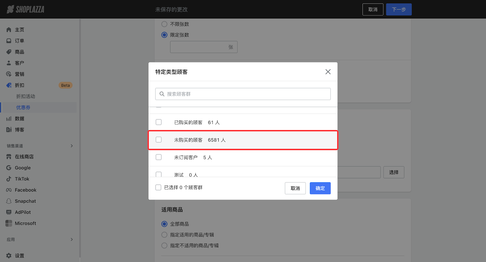 - 客户设置:选择特定客群为未购买客户(即针对新客可用)