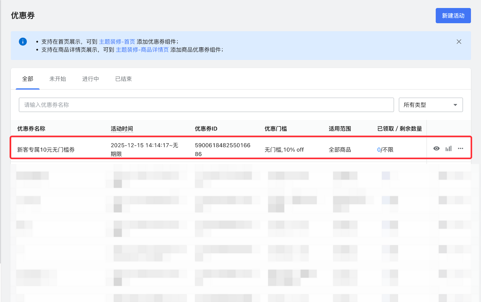 新店的首单体验,是客户信任的起点,也是品牌印象的锚点。将优惠券与满减活动清晰展示在前端能够提前传递店铺优惠讯息、降低决策门槛,在竞争初刻赢得关注与好感。以下将介绍如何将活动信息展示在前端,可根据您的实际需求选择配置: