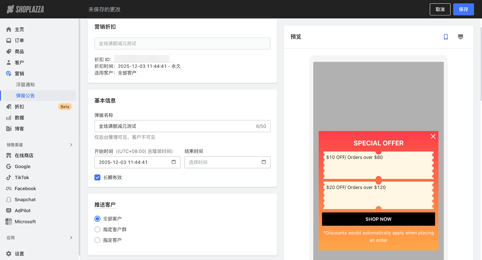 方式3 设置活动弹窗:可为满减活动设置弹窗,方便进入网站的客户第一时间看到活动弹窗,弹窗配置具体操作可参考:弹窗公告 | 折扣类弹窗。