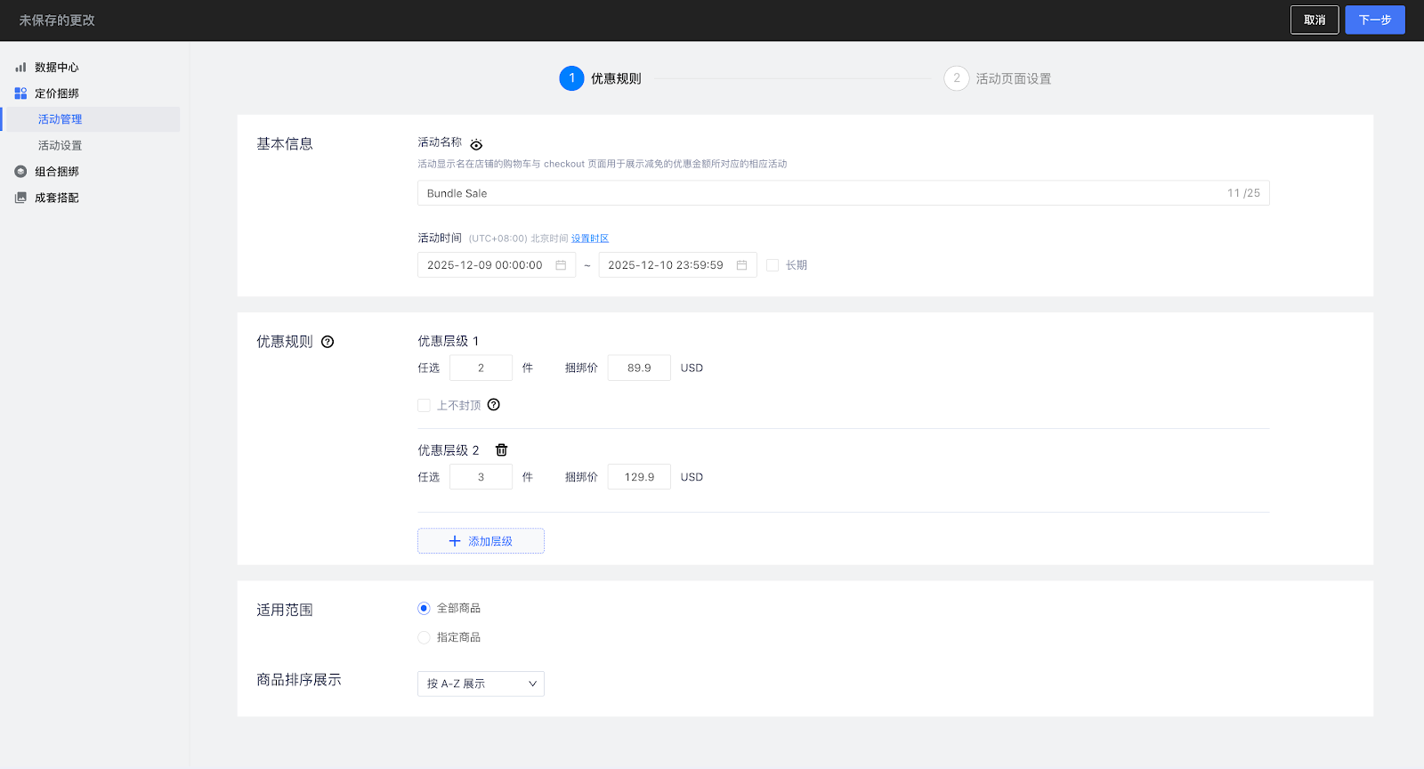 2. 以设置定价捆绑为例设置具体优惠规则,详细创建教程可参考:定价捆绑。