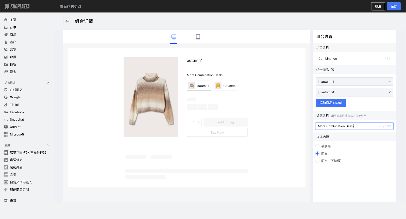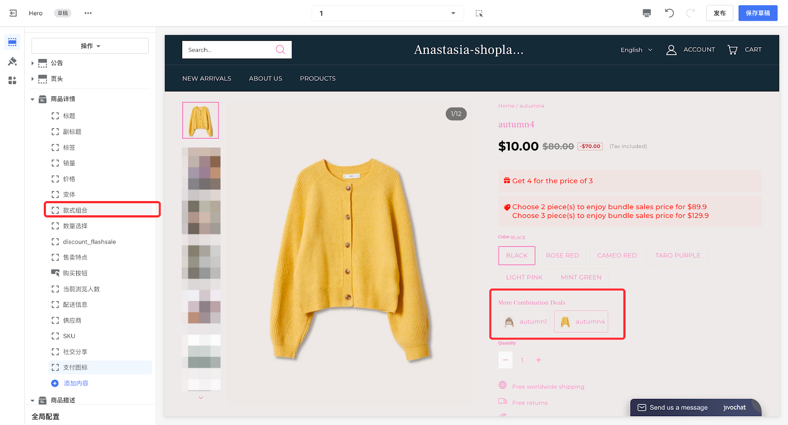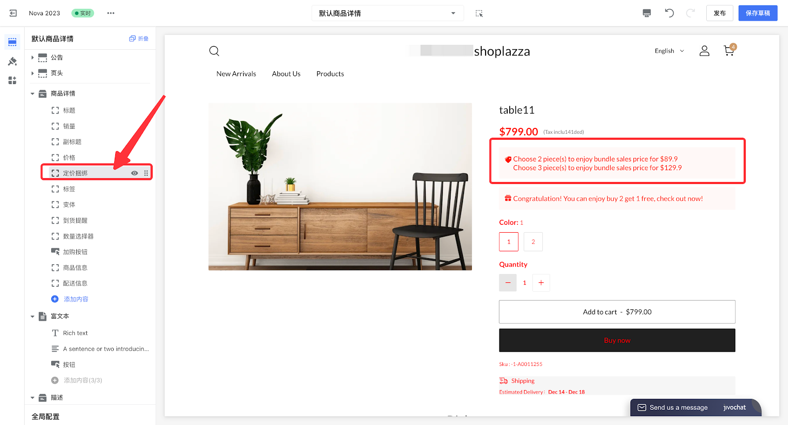 - 添加卡片展示:点击进入在线商店 > 主题装修 > 编辑,顶部选择商品详情页,在商品详情部分点击添加【定价捆绑】卡片。
