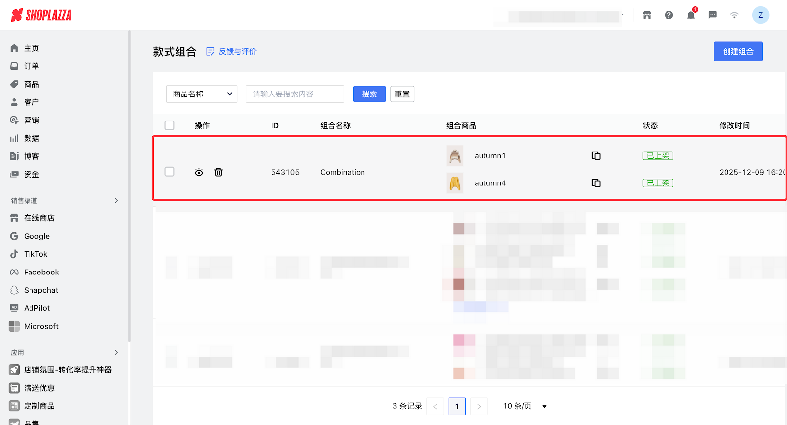 3. 点击保存,可在列表中看到已设置好的款式组合信息。
