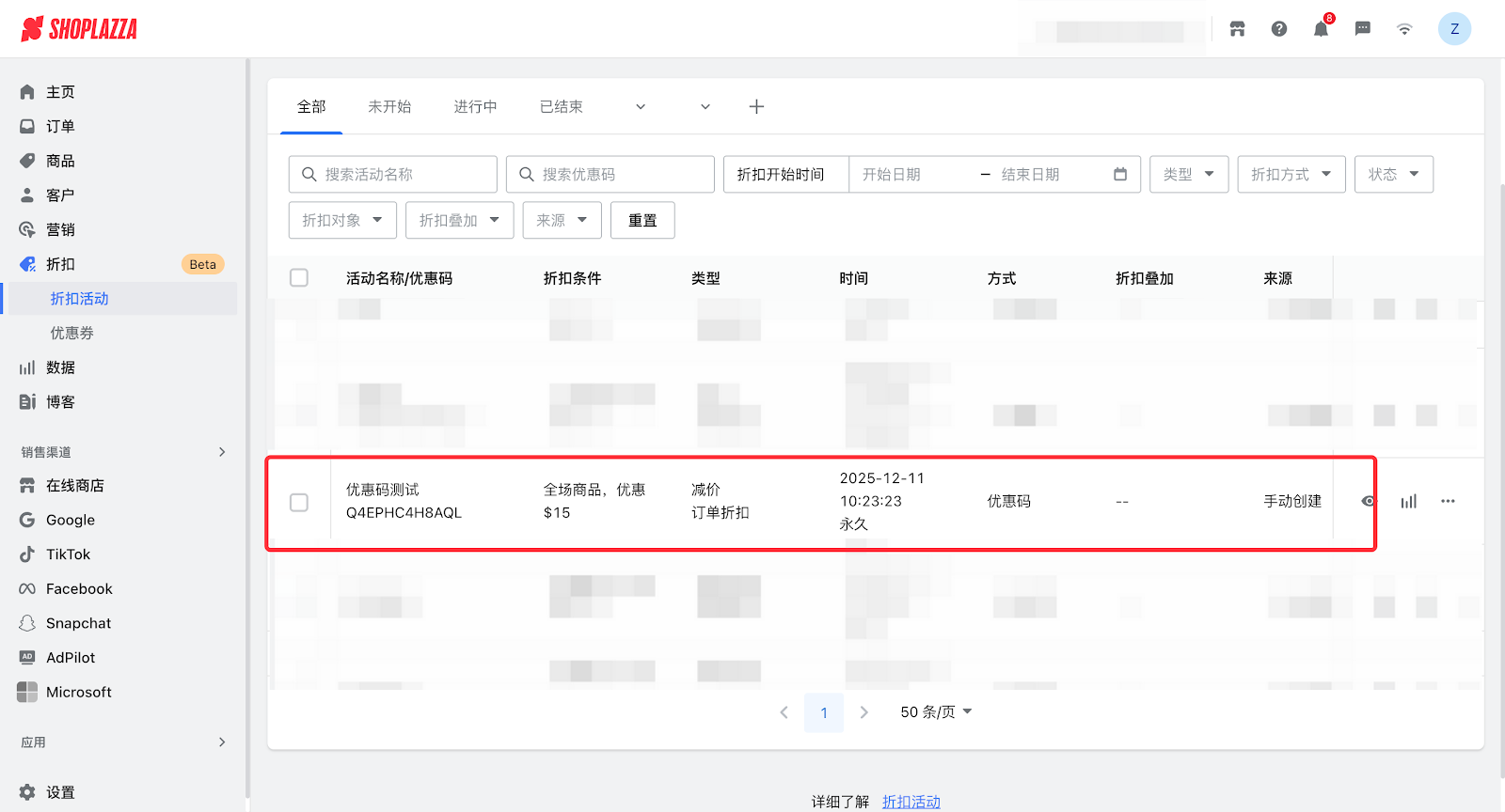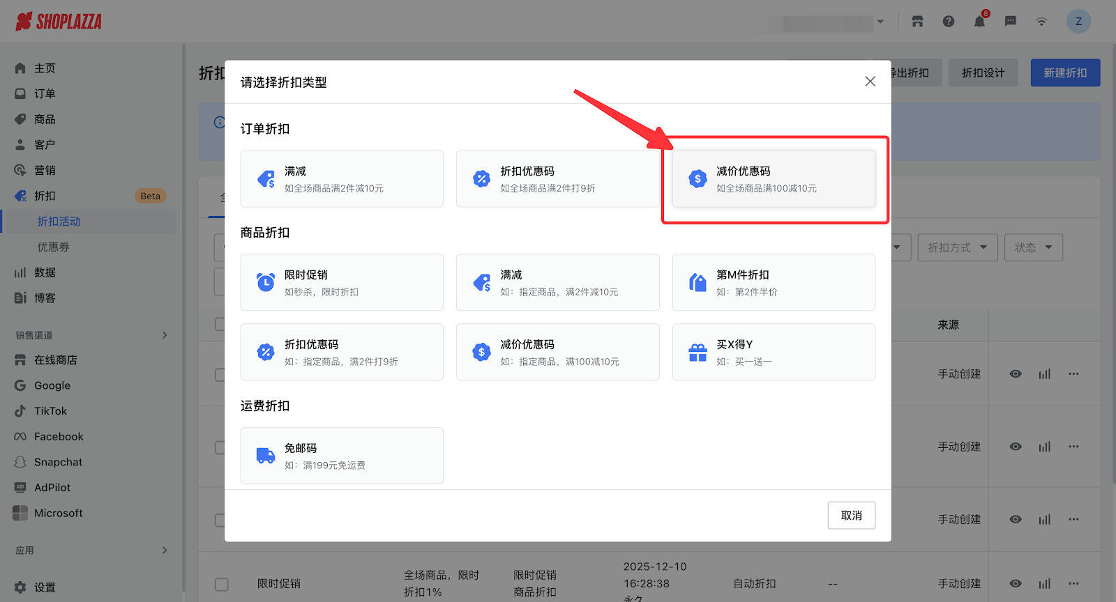 2. 本篇文章的活动是店铺复购的激活,所以选择订单折扣维度的优惠码活动为例设置减价优惠码,减价优惠码详细创建教程可参考:设置优惠码