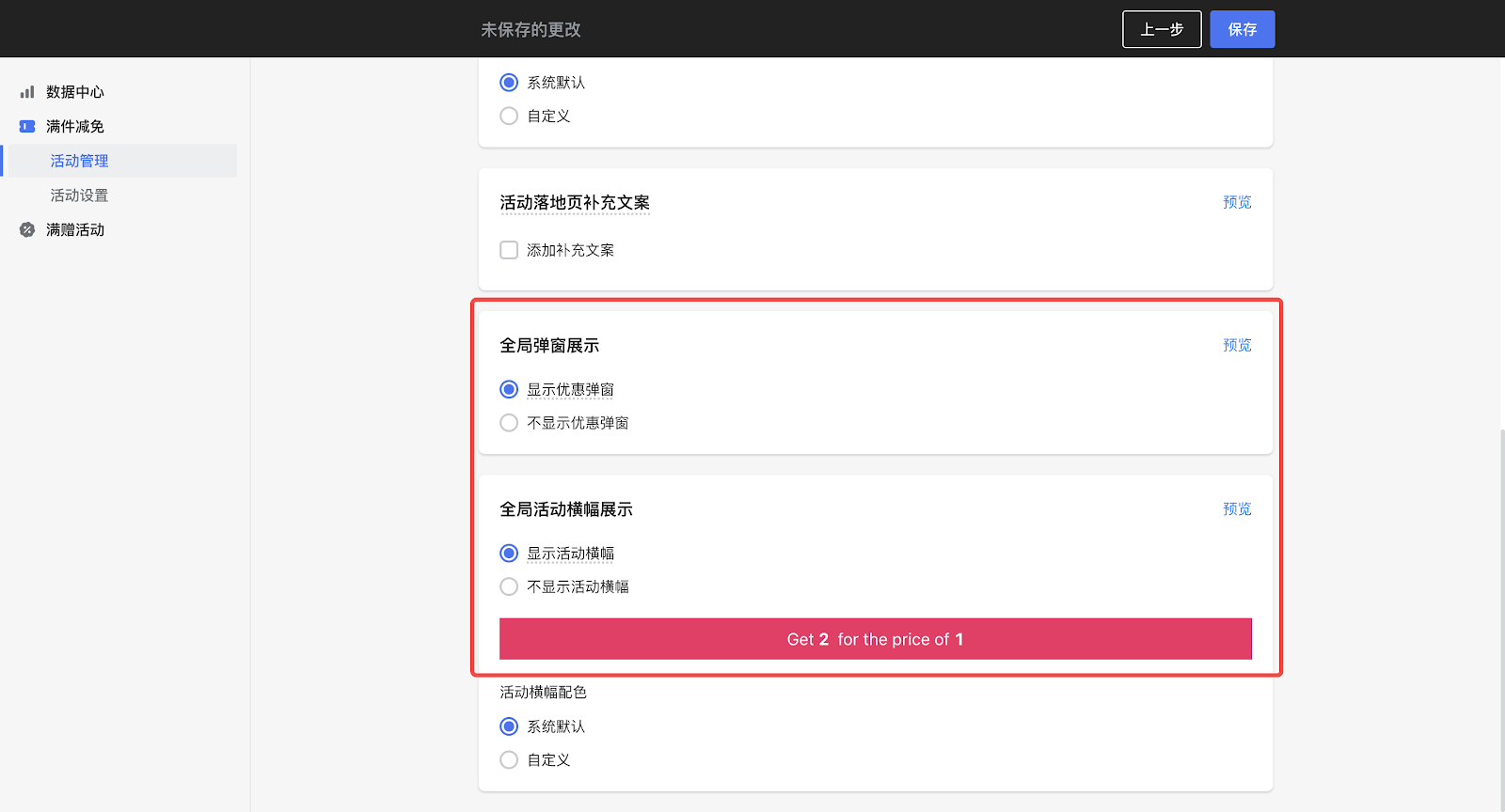 • 可在满送优惠插件内设置展示全局弹窗和全局横幅。