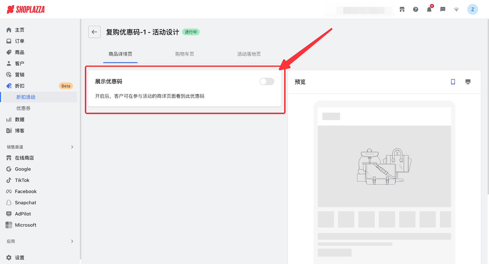 3. 不开启优惠码展示:该活动是针对复购客户,因此要关闭商品详情页展示优惠码活动。