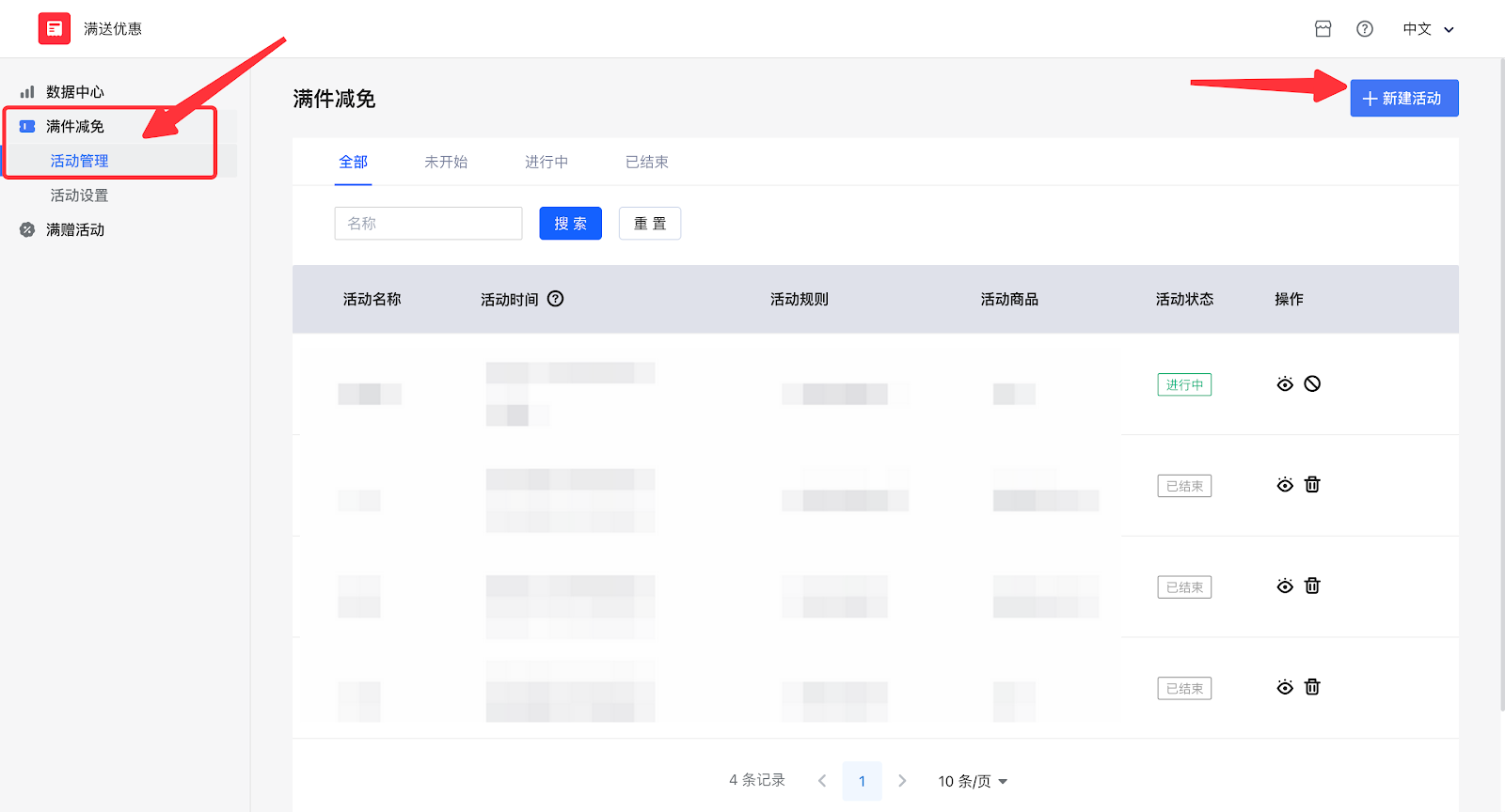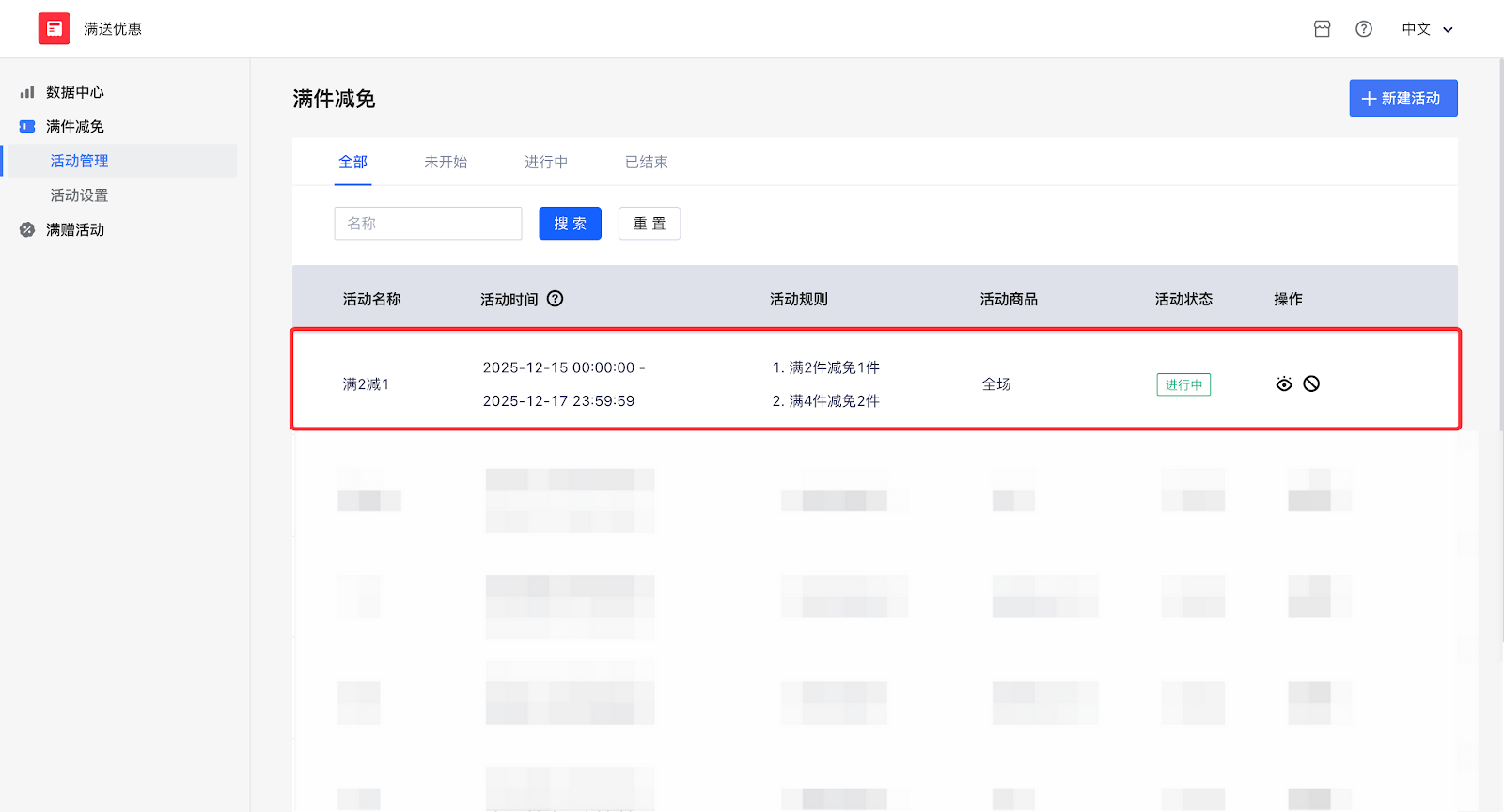 2. 以设置满件减免活动为例进行设置,满件减免详细设置教程可参考:满送优惠插件