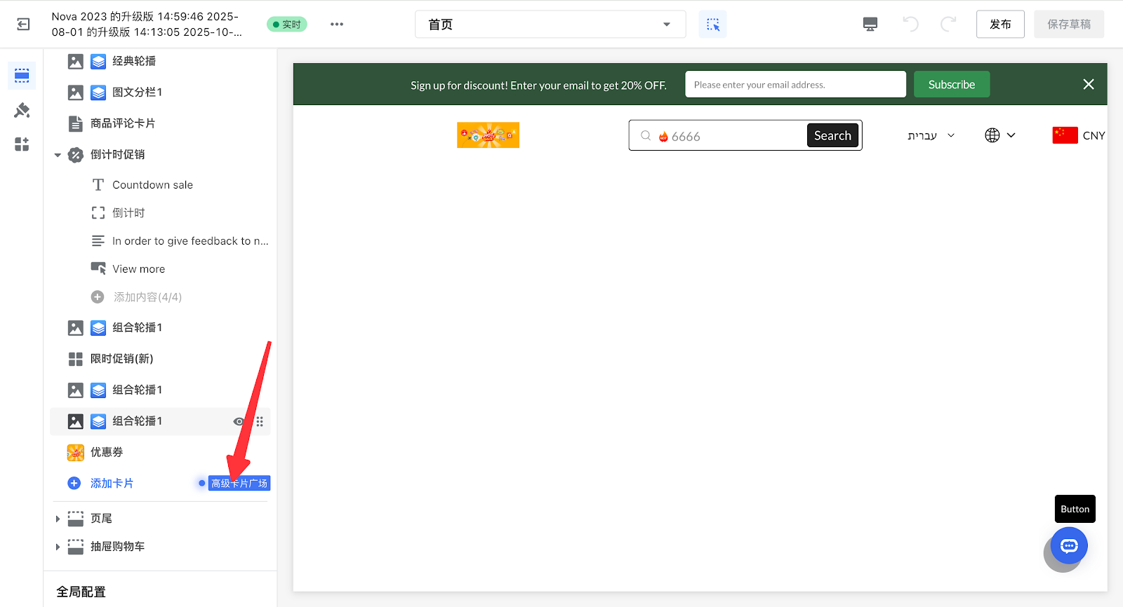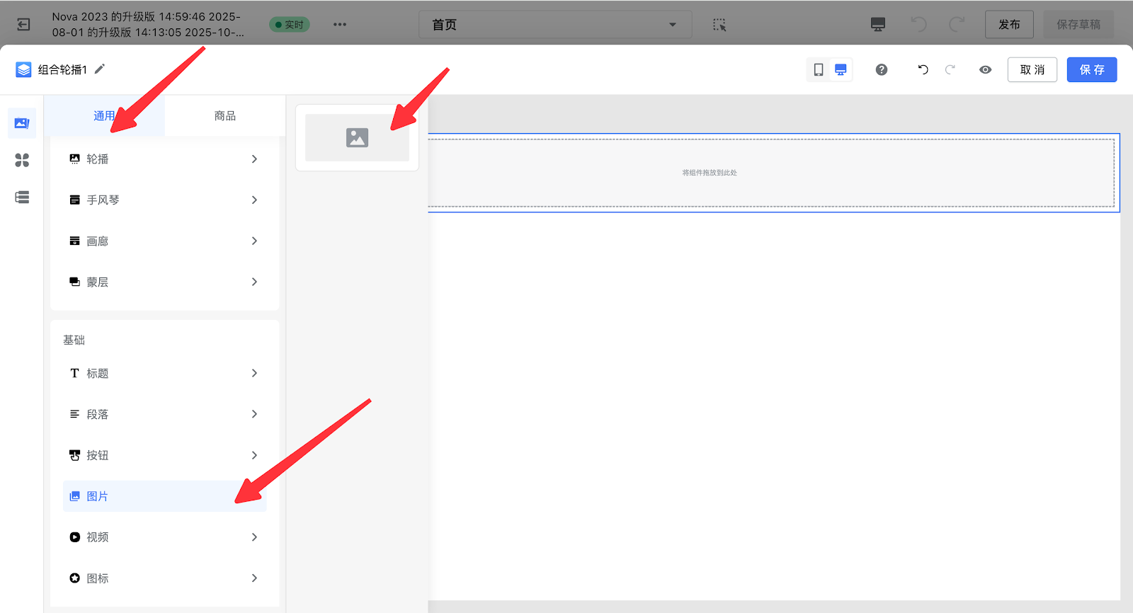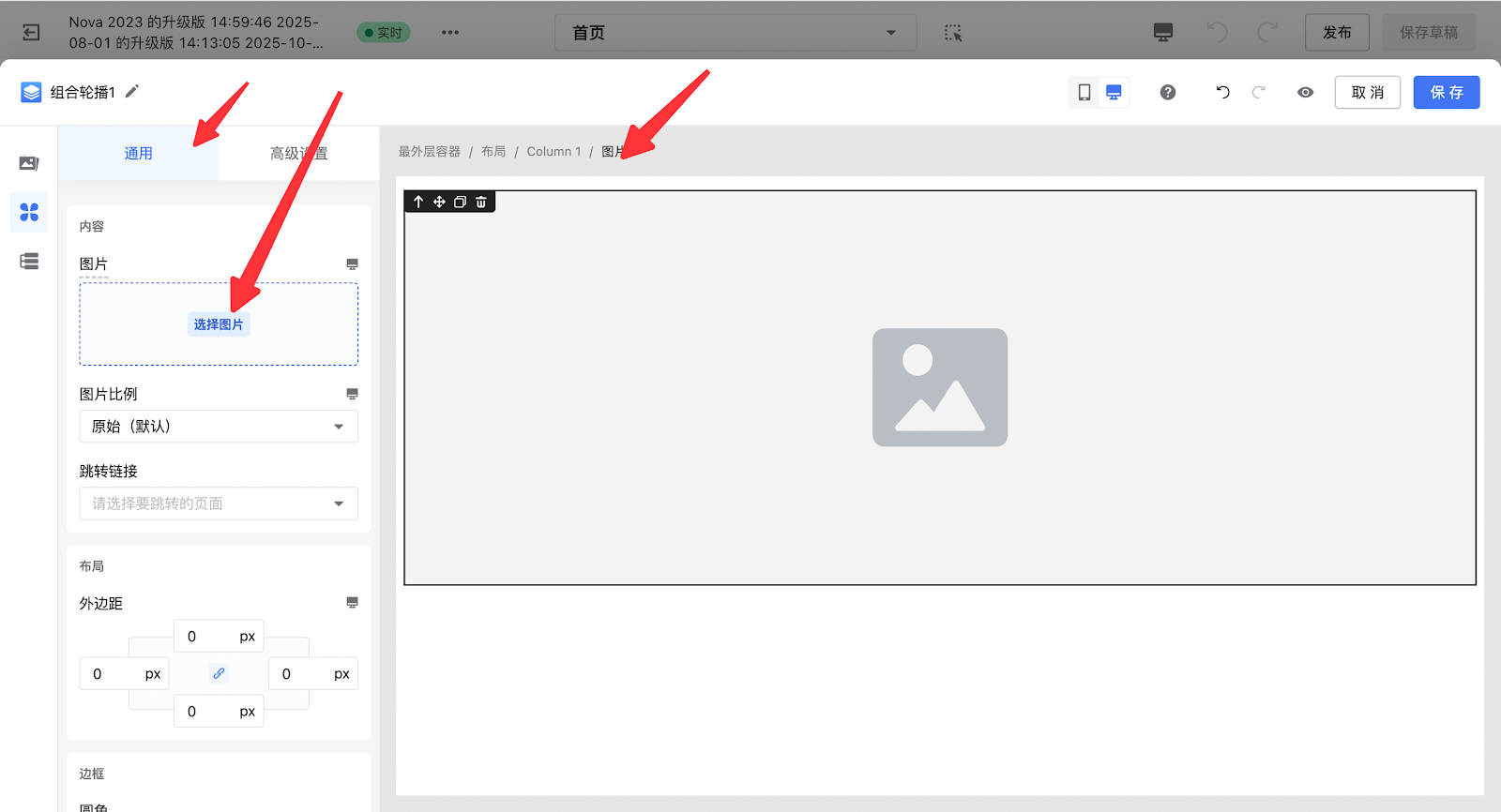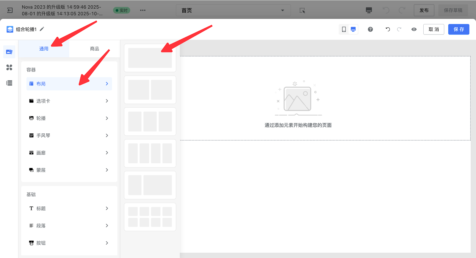 2. 点击高级卡片广场,任意添加一个高级卡片(本文以组合轮播1为例),选中布局层级,删除原有模版。