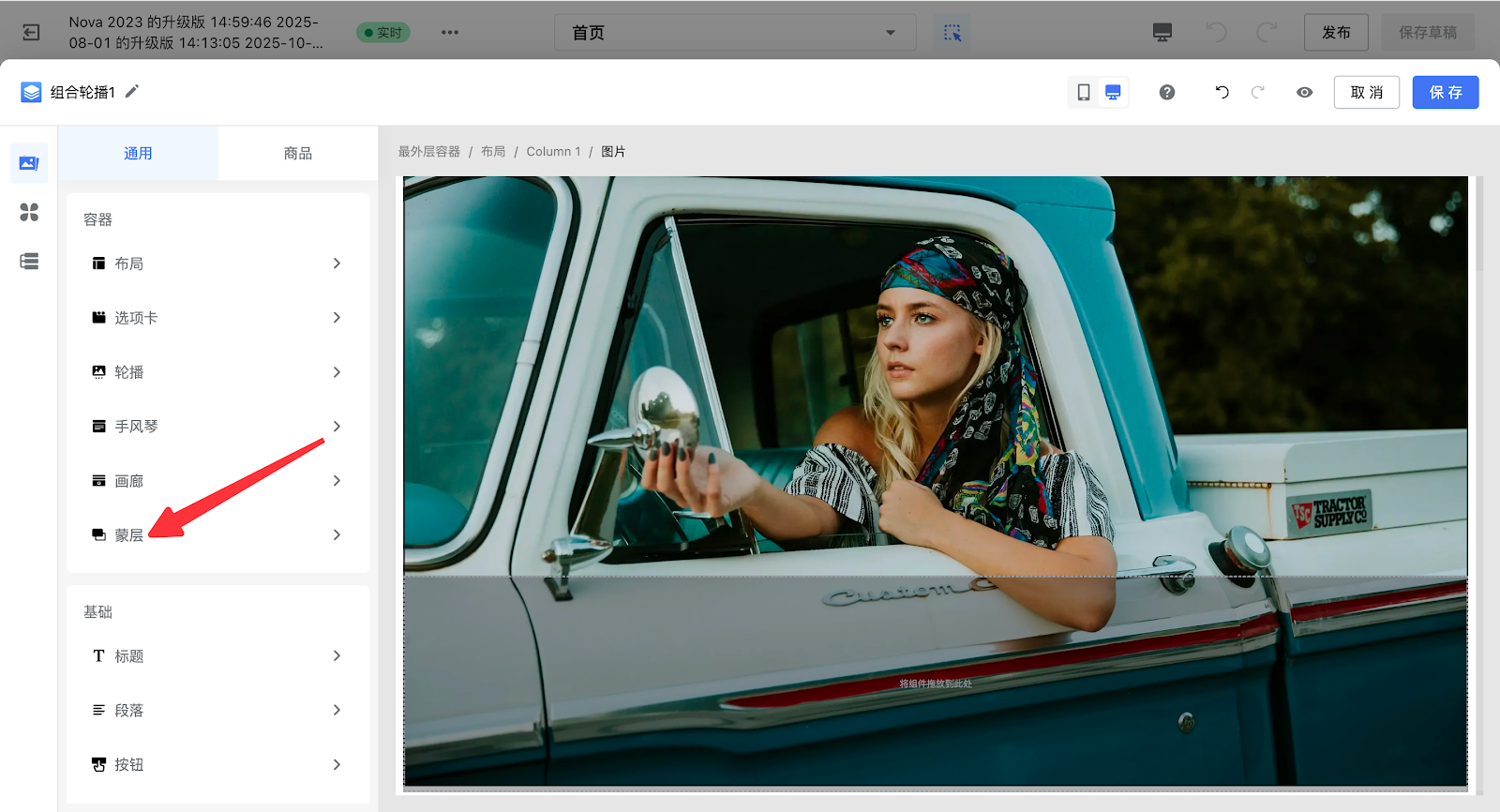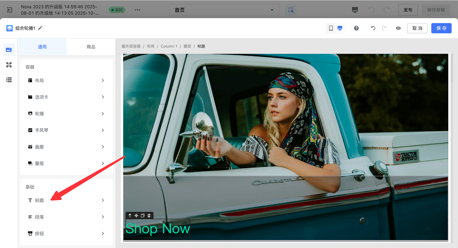 5. 将【标题】组件插入在【蒙层】上方,可输入相应的文字内容,您可以在【标题】层级中修改字体大小等。