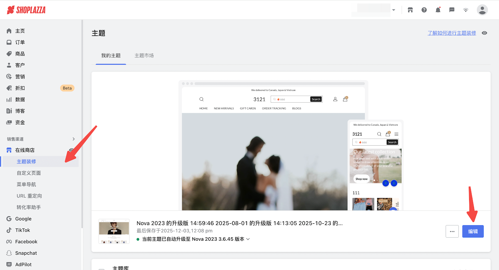 1. 登录您的Shoplazza管理后台,点击在线商店 > 主题装修,点击编辑按钮。