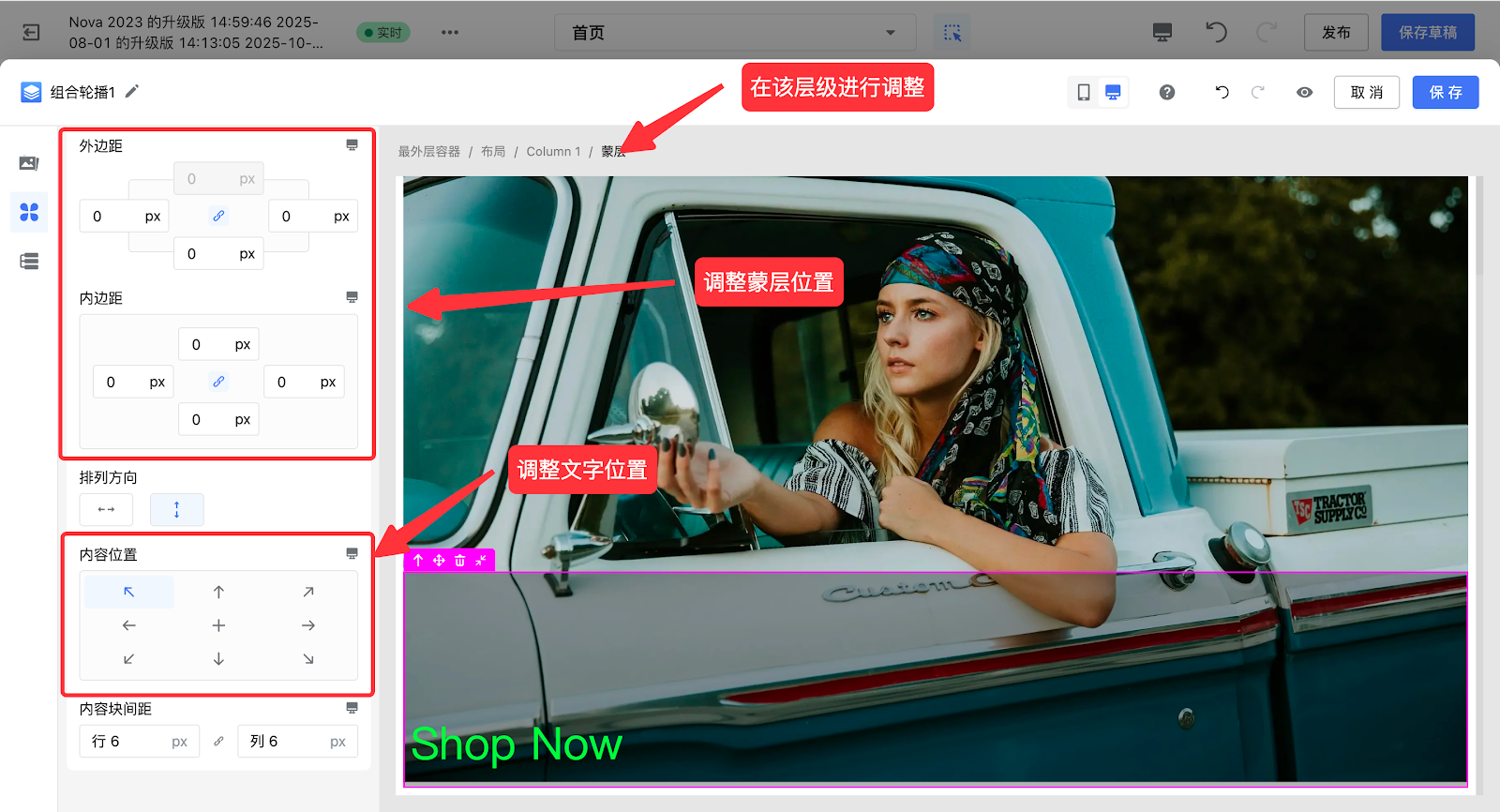6. 在【蒙层】层级来调整文字位置,蒙层大小等其他配置项。