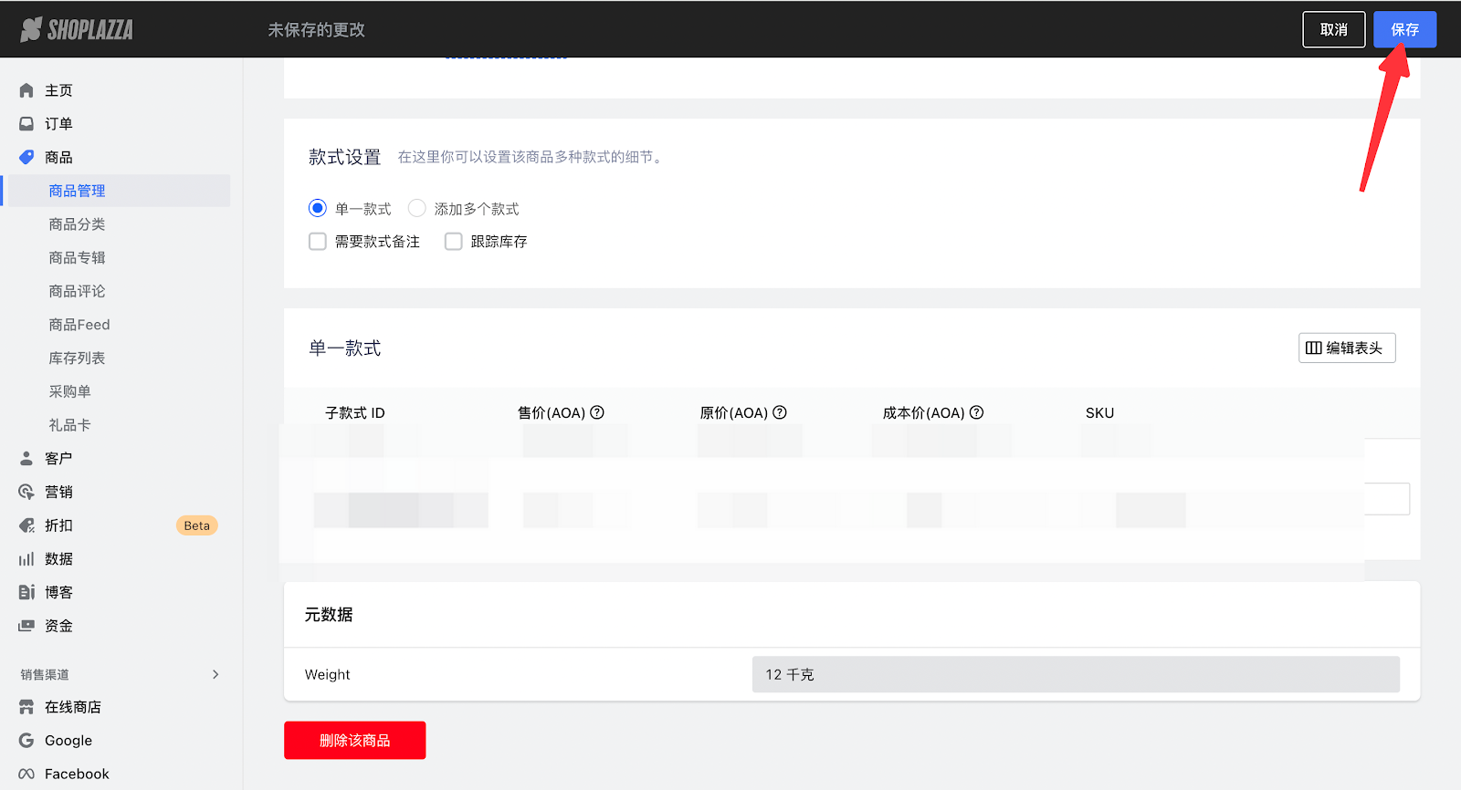 3. 回到您的Shoplazza管理后台,点击商品 - 商品管理,进入编辑商品界面,对商品元数据进行赋值操作(本文赋值为12KG),点击保存。