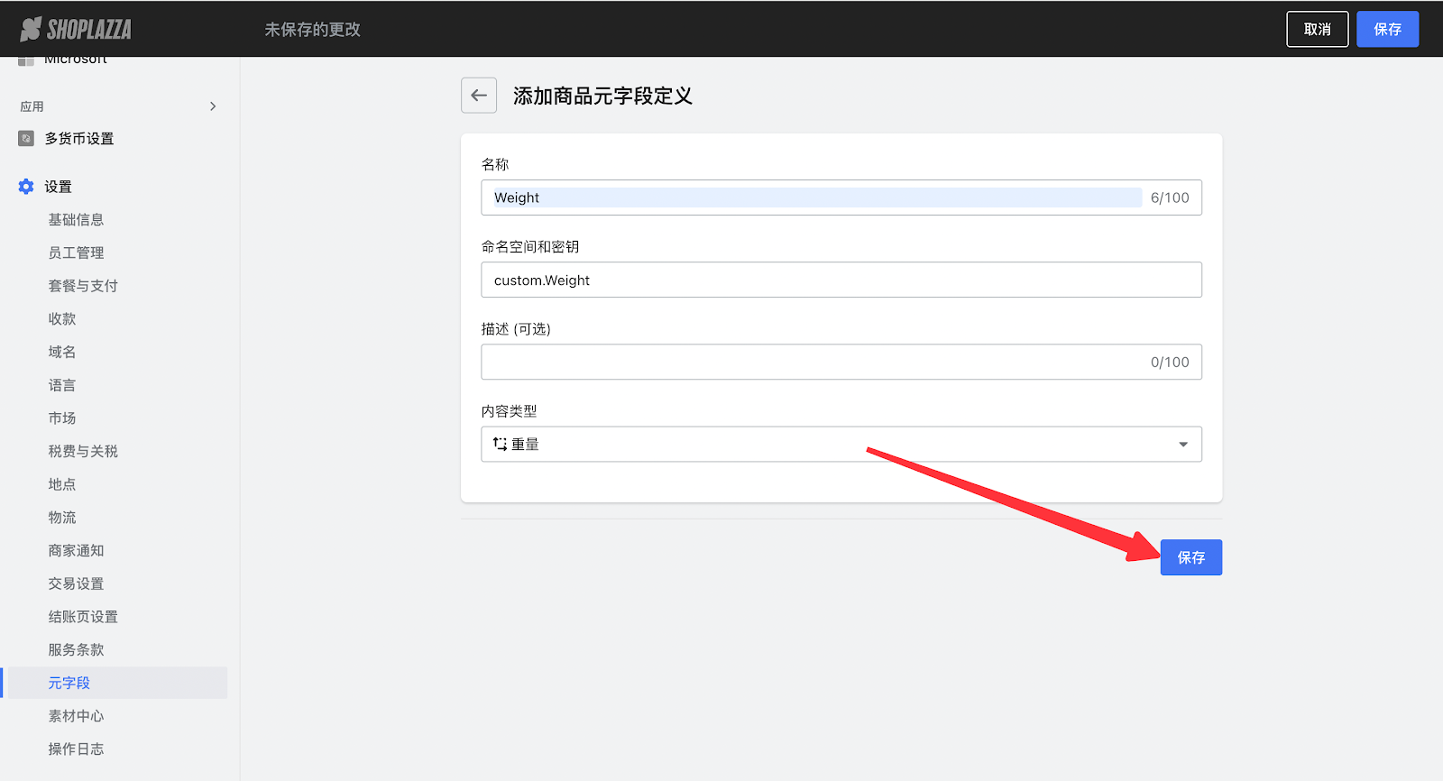 2. 点击商品 - 添加字段,对商品元字段进行赋值(本文以Weight为例),点击保存。