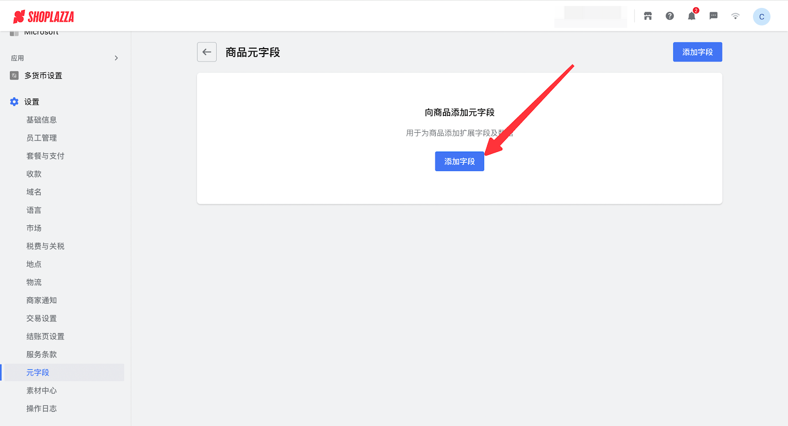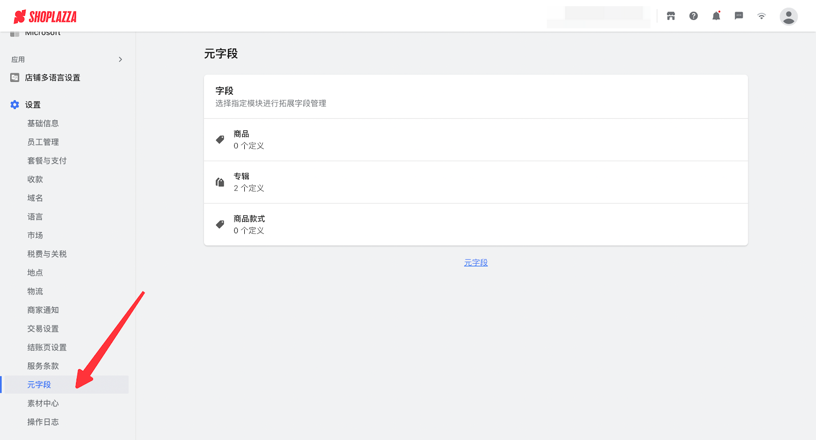 1. 登录您的Shoplazza管理后台,点击设置 > 元字段,打开元字段设置页面。