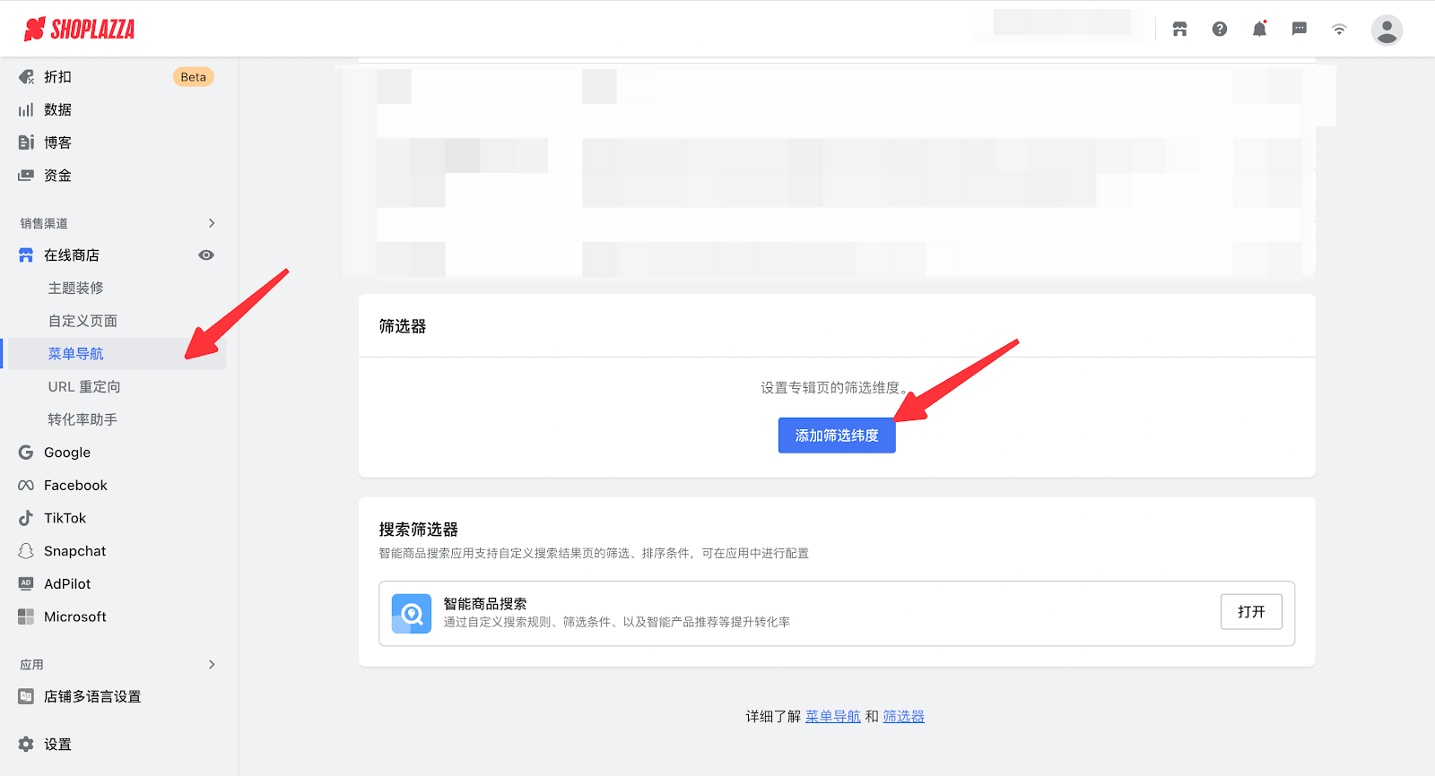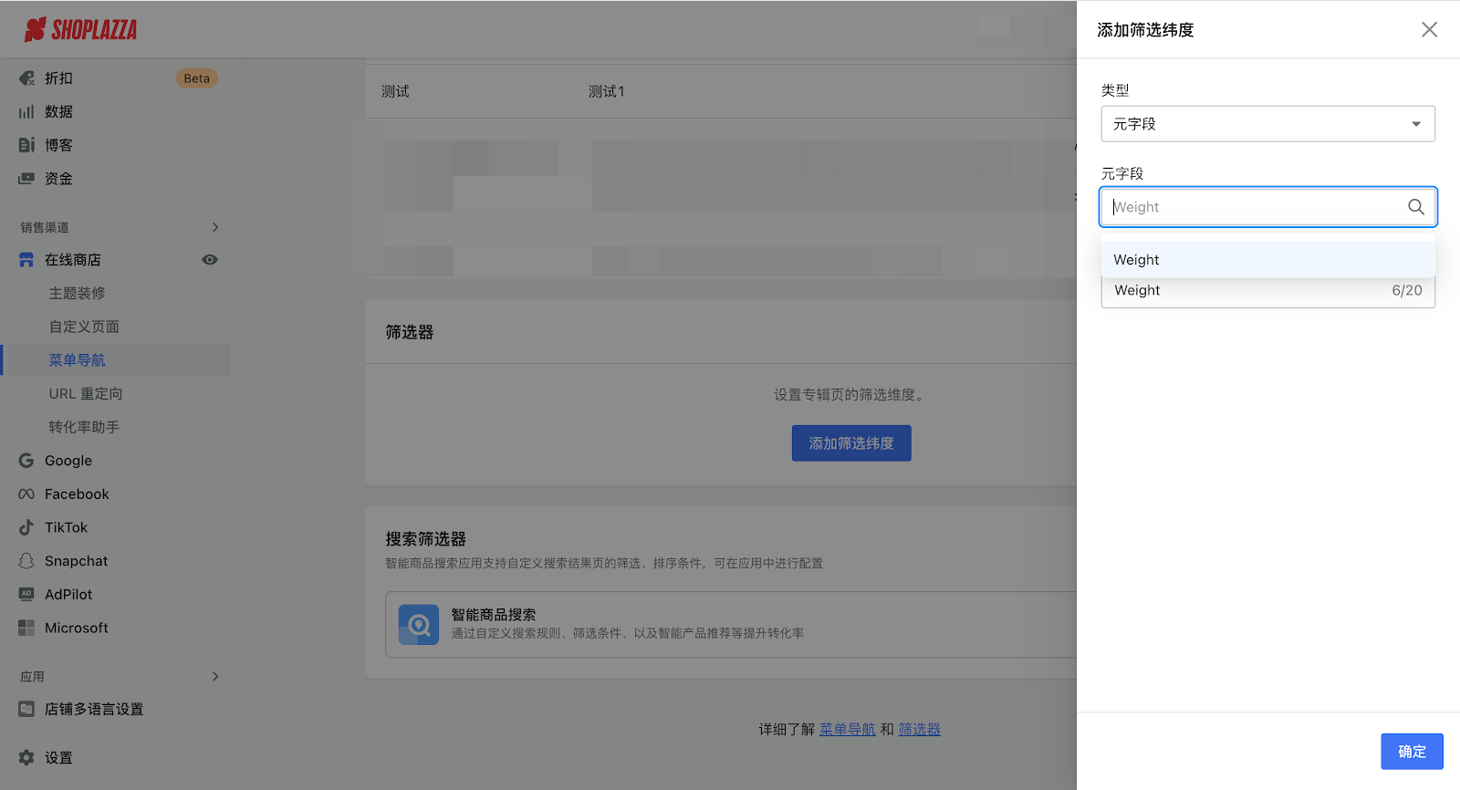 4. 登录您的Shoplazza店铺管理后台,点击菜单导航 > 添加筛选纬度,添加配置好的元字段,点击确定。