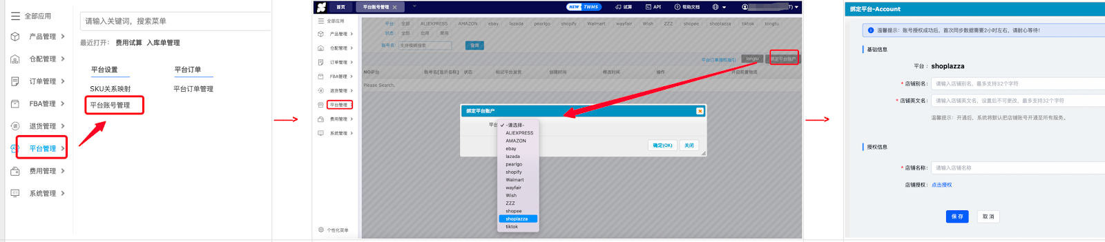 2. 点击平台账号管理。(点击“平台订单授权指引”可查看不同平台授权指引文档)