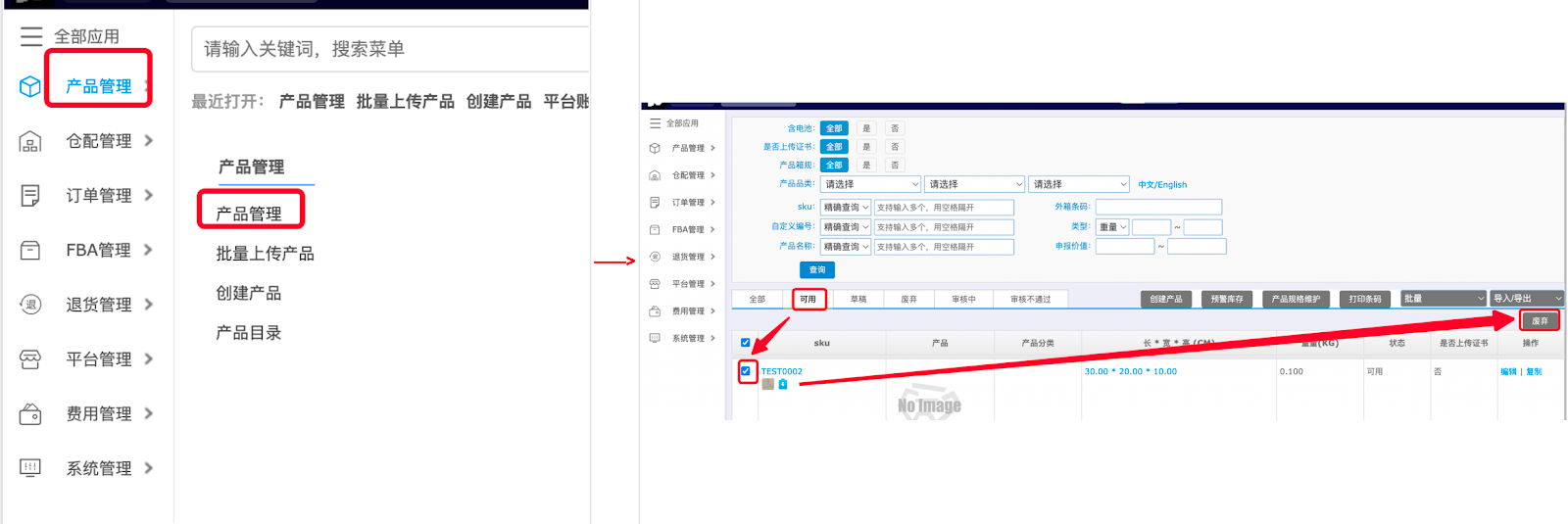2. 勾选需要废弃的产品SKU,点击废弃。