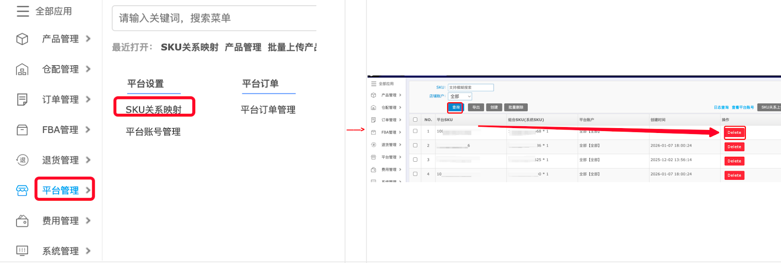 3. 勾选需要解绑的SKU数据,点击右侧Delete。