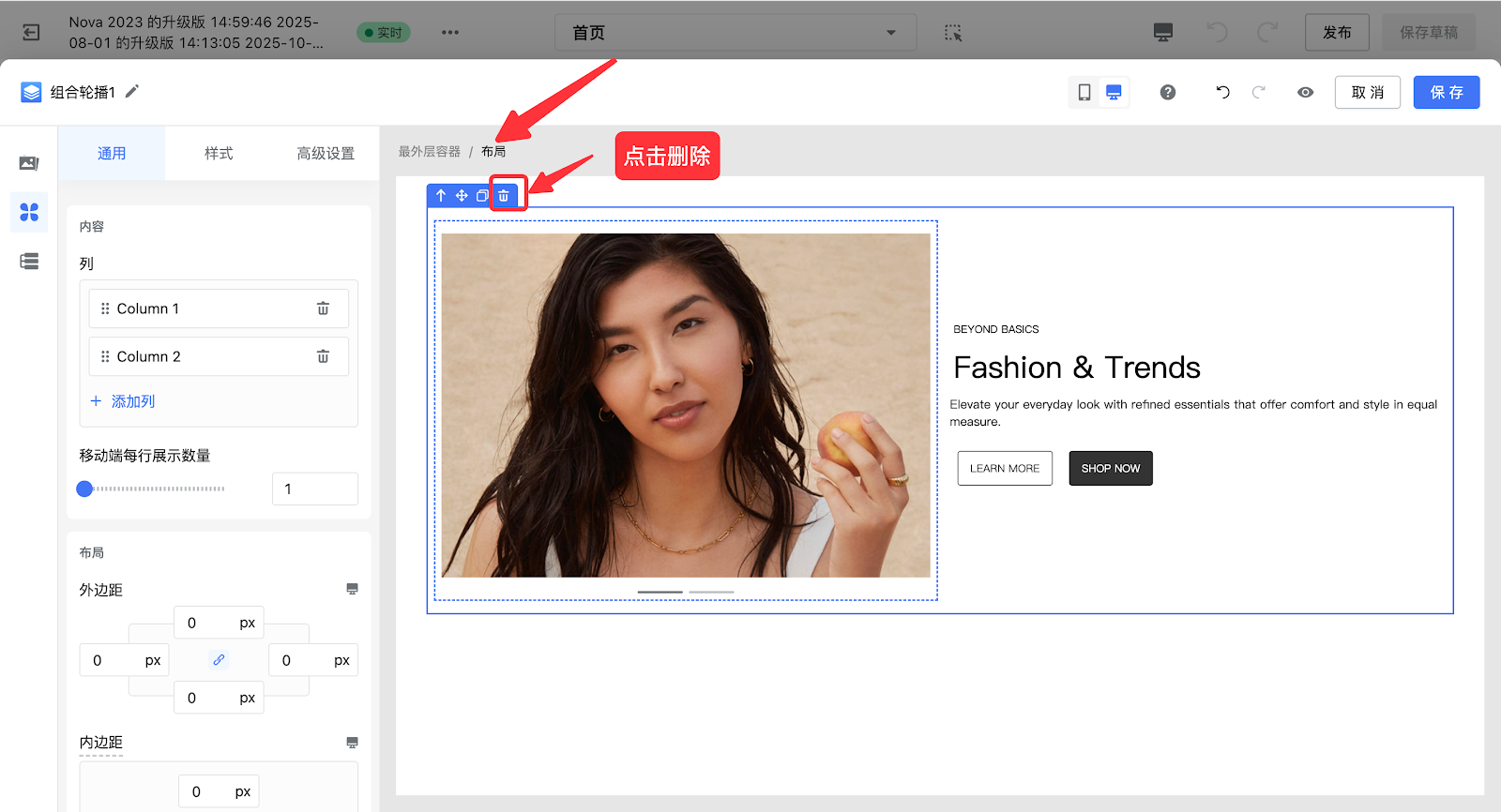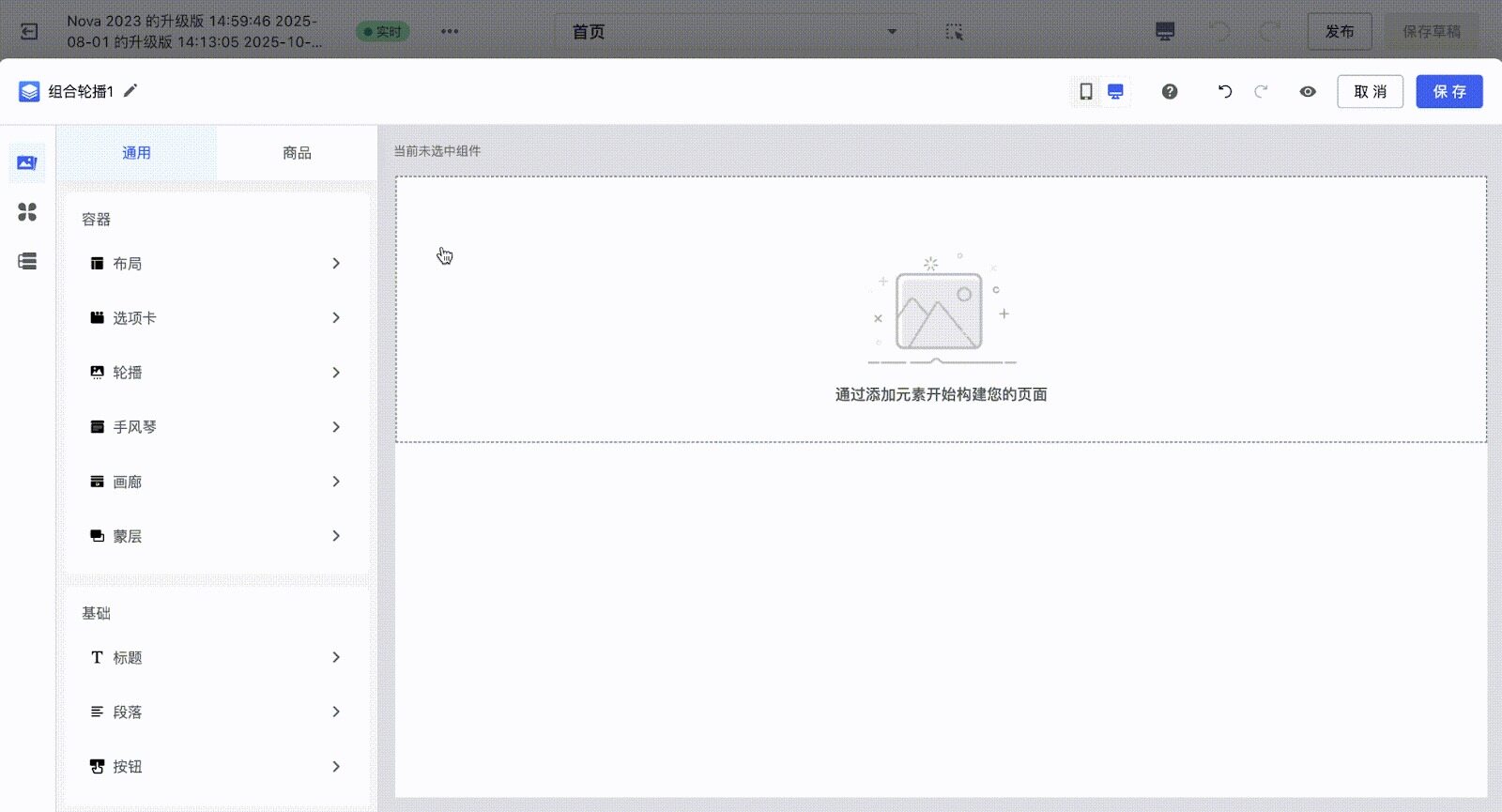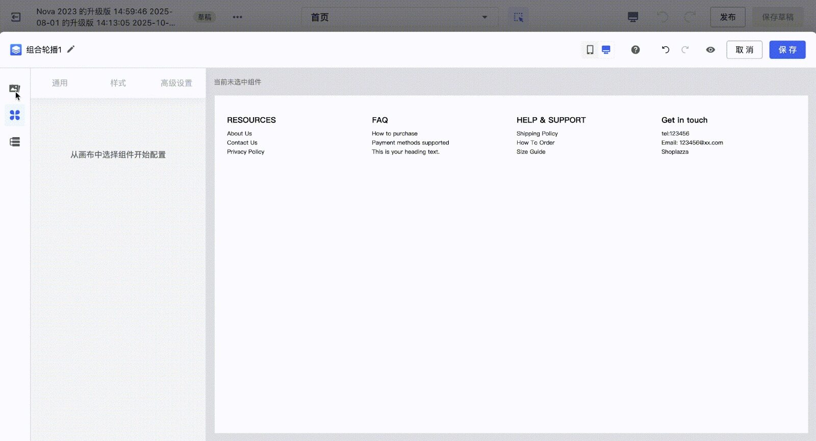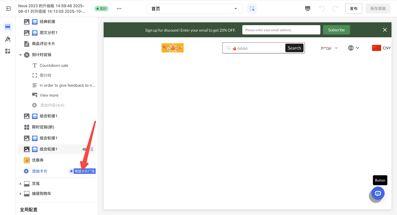 2. 点击高级卡片广场,任意添加一个高级卡片(本文以组合轮播1为例),选中布局板块,点击蓝色框删除原有模版。