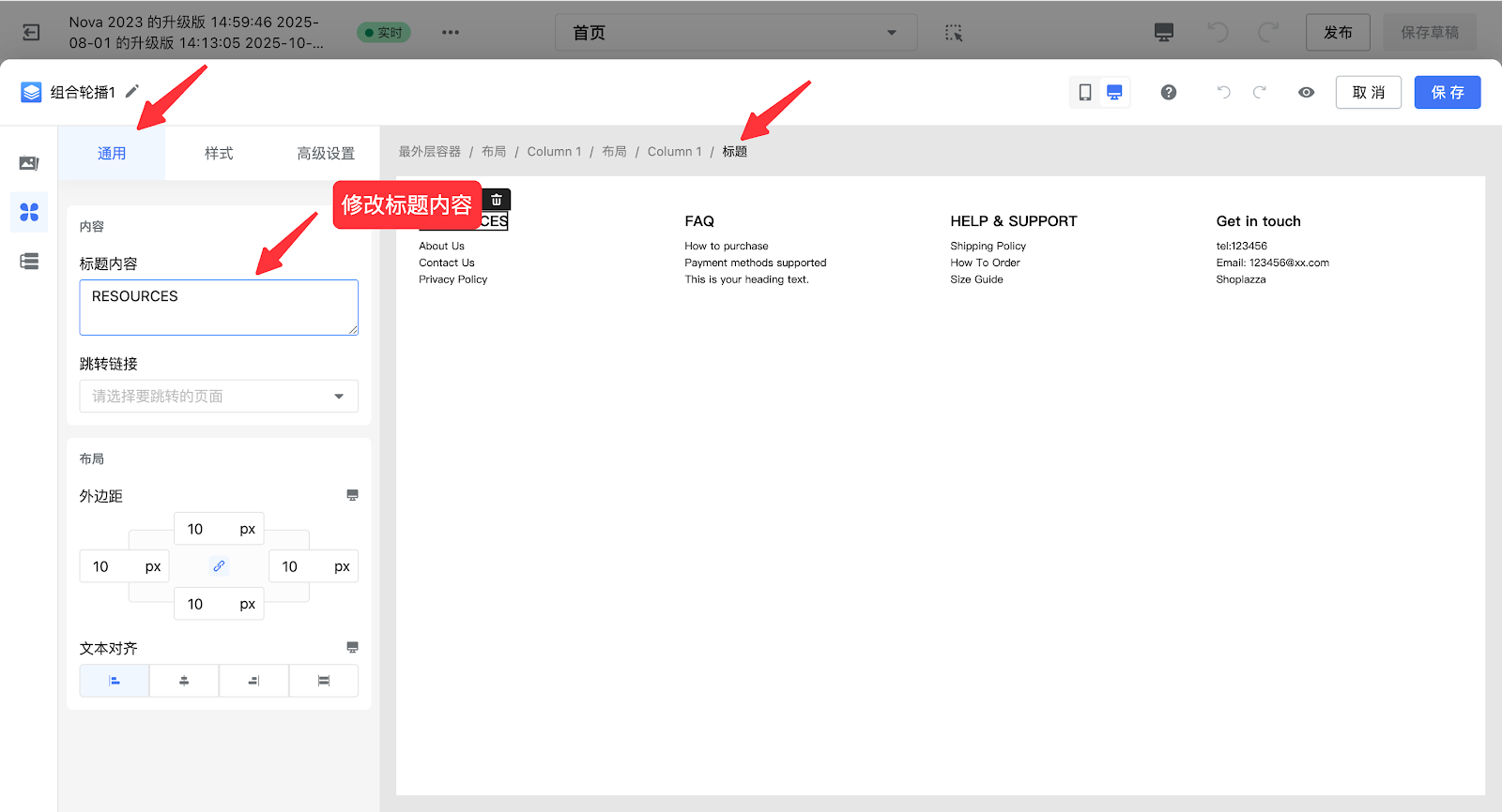 8. 点击标题 - 通用修改标题内容,如需修改其他菜单内容,可同样选中其他菜单进行修改。
